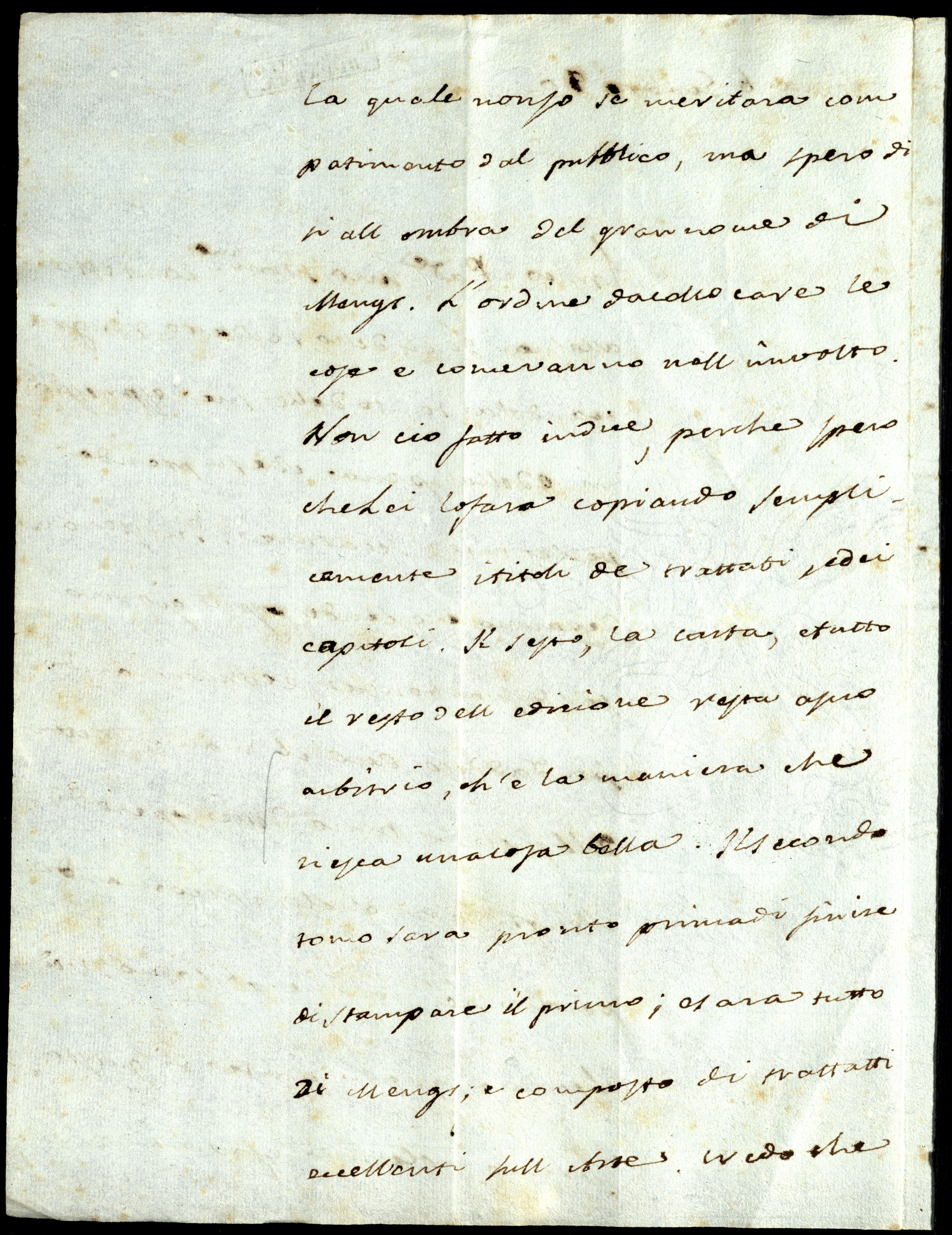 E cominciando fin d’addeso, ecco il manuscritto dell primo tomo delle opere di Mengs. Non glielo raccomando perché Lei non ne ha bisogno. Vedrà che una gran parte di questo primo volume è farina mia, la quale non so se meritarà compatimento dal pubblico, ma spero di sì all’ombra del gran nome di Mengs. L’ordine da collocare le cose è come vanno nell’involto. Non ci ho fatto indize perché spero che Lei lo farà copiando semplicemente i titoli de[i] trattati e dei capitoli. Il sesto, la carta e tutto il resto dell’edizione resta a Suo arbitrio, ch’è la maniera che riesca una cosa bella.