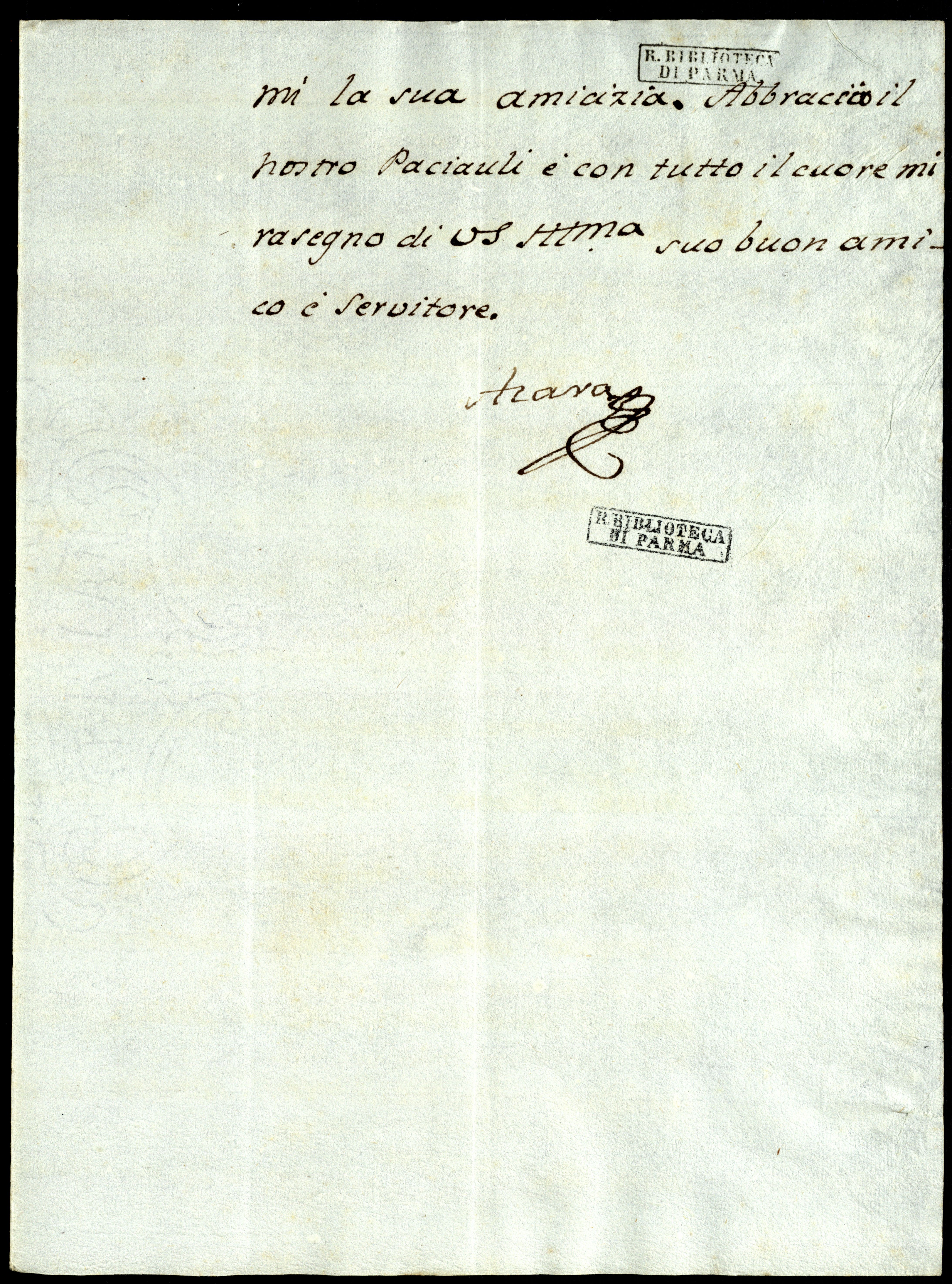 Basta di secare Vostra Signoria Illustrissima: La prego a continuarmi la Sua amicizia, abbraccioi il nostro Paciaulik e, con tutto il cuore, mi rasegno di Vostra Signoria Illustrissima Suo buon amico e servitore,