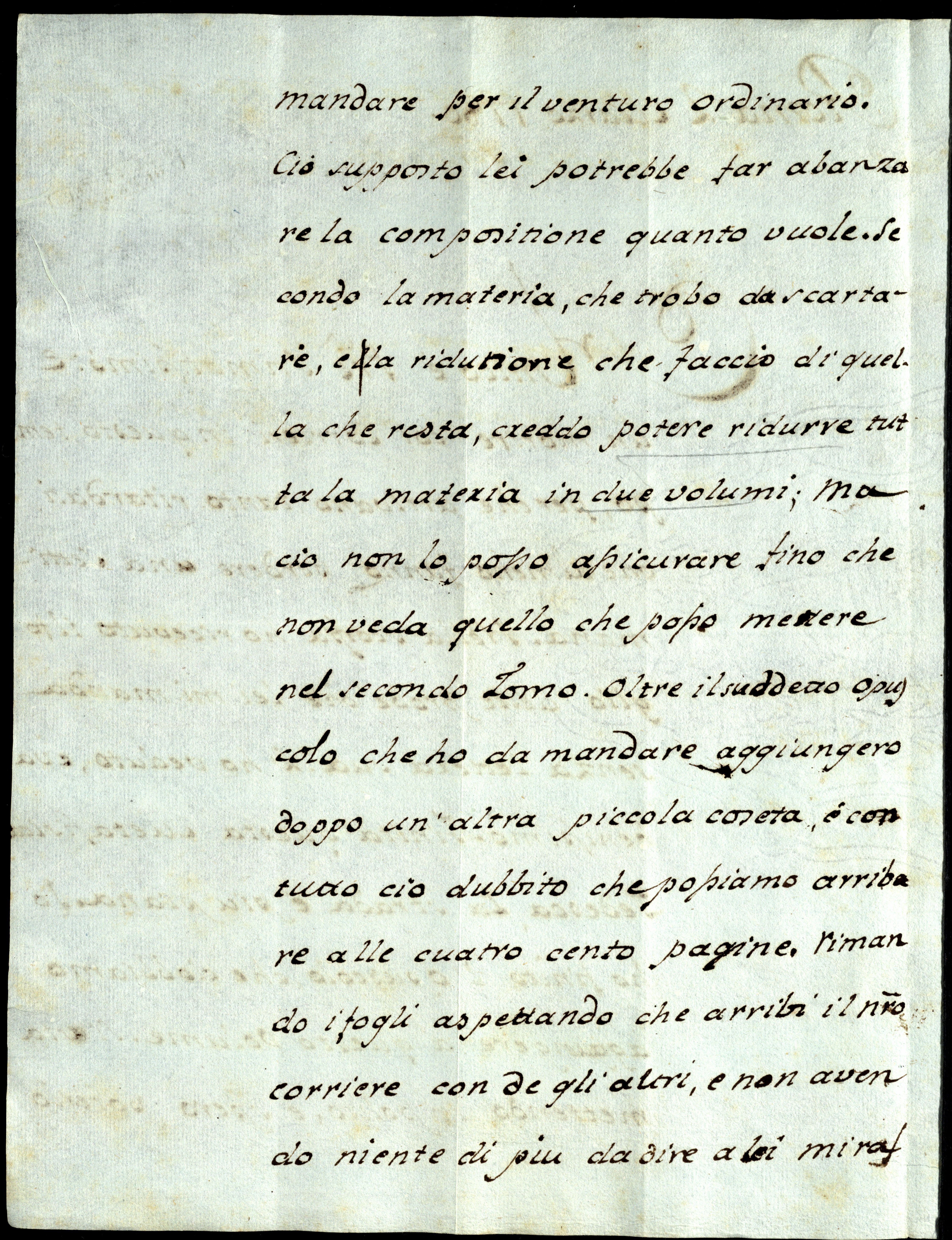Finita questa metafisica tedesca, la strada è più piana. Io ho finito l’opuscolo che dobbiamo agiungerea a questo volume. Si stab mettendo in polito e spero poterlo mandare per il venturo ordinario. Ciò supposto, Lei potrebbe far abanzare la compositione quanto vuole. Secondo la materia che trobo da scartare e lac ridutione che faccio di quella che resta, creddo potere ridurre tutta la materia in due volumi, ma ciò non lo posso assicurare fino che non veda quello che posso mettere nel secondo tomo. Oltre il suddetto opuscolo che ho da ma[n]dare, aggiungerò doppo un’altra piccola coseta e, con tutto ciò, dubbito che possiamo arribare alle cuatrocento pagine.