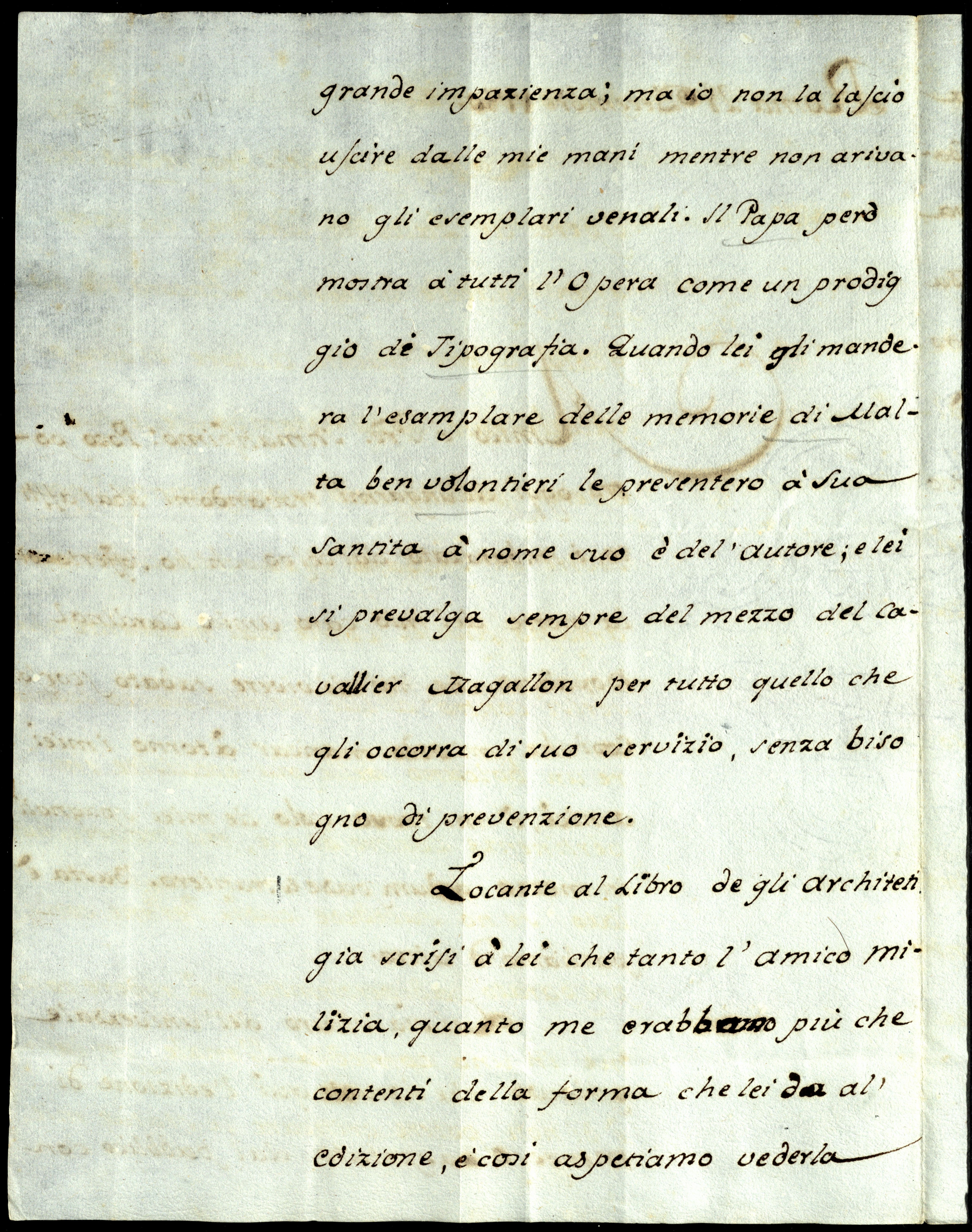 Lei sia sicuro del’universale aplauso che riscuotea qui l’edizione di Mengs. È aspetatab dal pubblico con grande impazienza, ma io non la lascio uscire dalle mie mani mentre non arivano gli esemplari venali. Il Papa però mostra a tutti l’opera come un prodiggio dic tipografia. Quando Lei glid manderà l’esamplare delle Memorie di Malta, ben volontieri le presenterò a Sua Santità a nome Suo e del’autore. E Lei si prevalga sempre del mezzo del Cavallier Magallón per tutto quello che gli occorra di suo servizio, senza bisogno di prevenzione.