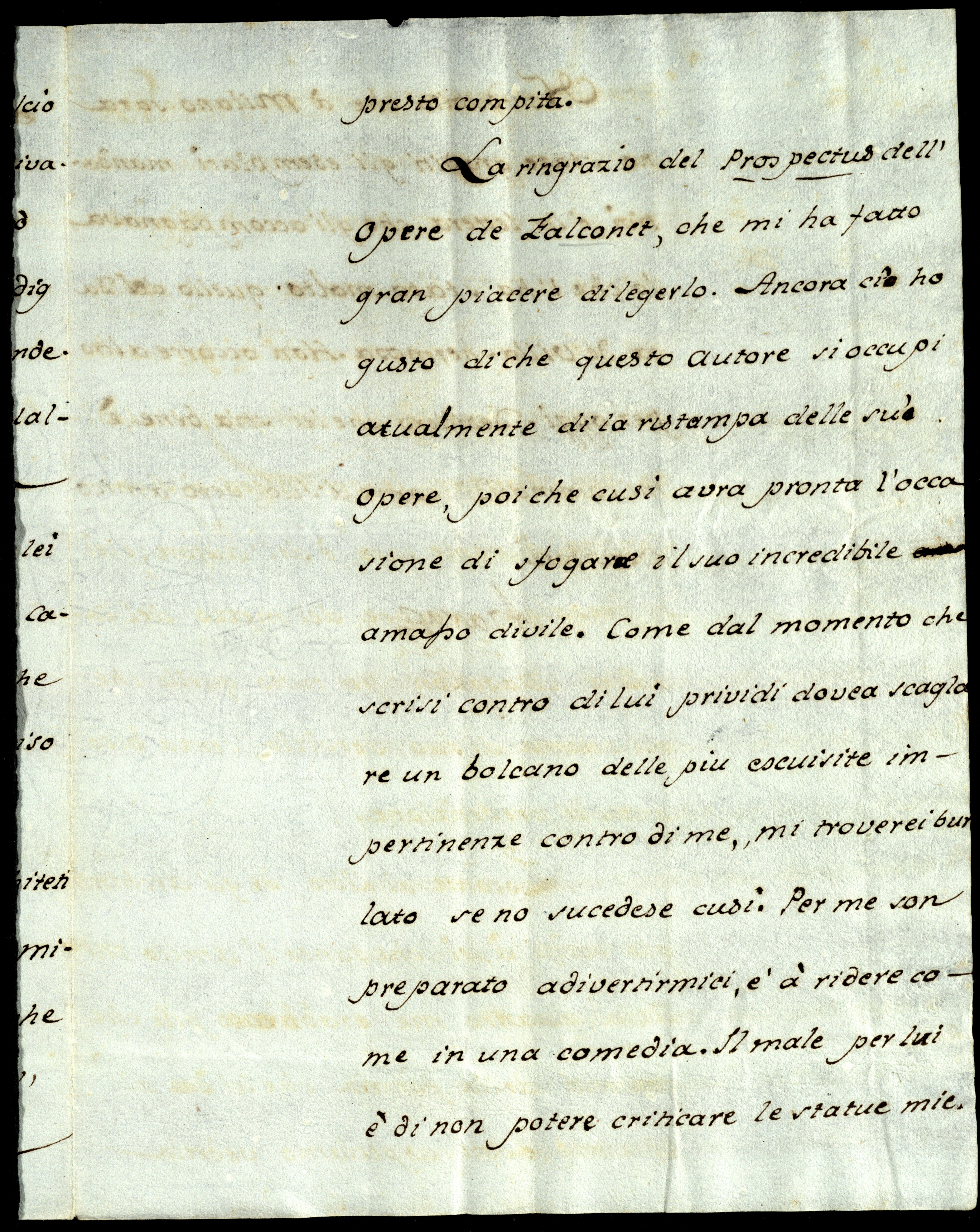 La ringrazio del prospectus dell’opere de Falconet, che mi ha fatto gran piacere di legerlo. Ancora cif ho gusto di che questo autore si occupi atualmente di la ristampa delle su’ opereg, poiché cusì [sic] avrà pronta l’occasione di sfogareh il suo incredibile amasso di vile. Come dal momento che scrisi contro di lui prividi dovea scaglare un bolcano delle più escuisite impertinenze contro di me, mi troverei burlato se no sucedese cusì [sic]. Per me son preparato a divertirmici e a ridere come in una comedia. Il male per lui è di non potere criticare le statue mie.