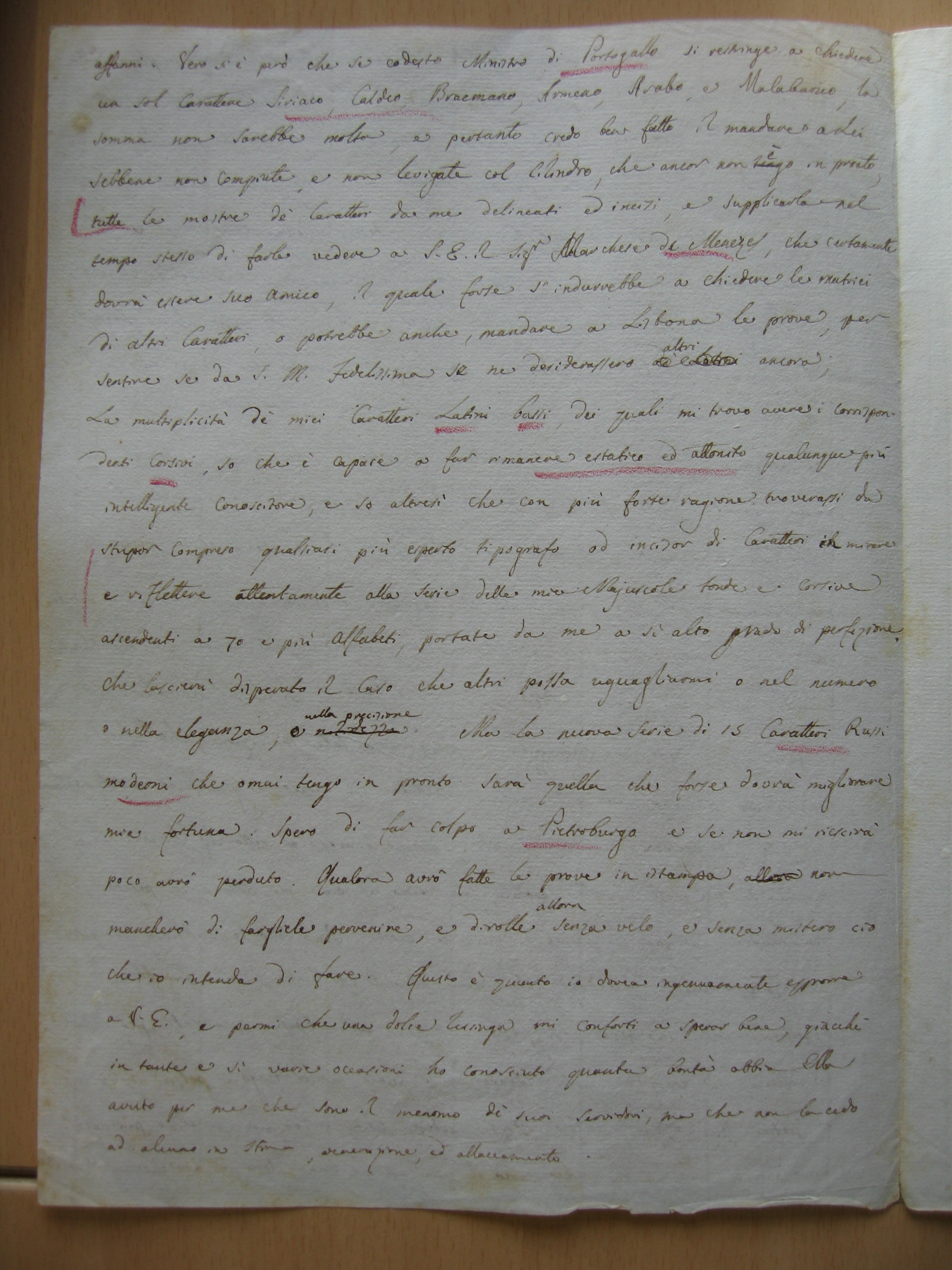 Vero si è però che se codesto Ministro di Portogallo si restringe a chiedere un sol carattere siriaco, caldeo, bracmano, armeno, arabo e malabarico, la somma non sarebbe molta e, pertanto, credo ben fatto il mandare a Lei –sebbene non compiute e non levigate col cilindro, che ancor non èh in pronto– tutte le mostre de’ caratteri da me delineati ed incisi; e supplicarLa nel tempo stesso di farle vedere a Sua Eccellenza il Signor Marchese de Menezes, che certamente dovrà essere Suo amico, il quale forse s’indurrebbe a chiedere le matrici di altri caratteri o potrebbe anche mandare a Lisbona le prove per sentire se da Sua Maestà Fedelissima se ne desiderassero altrih ancora.