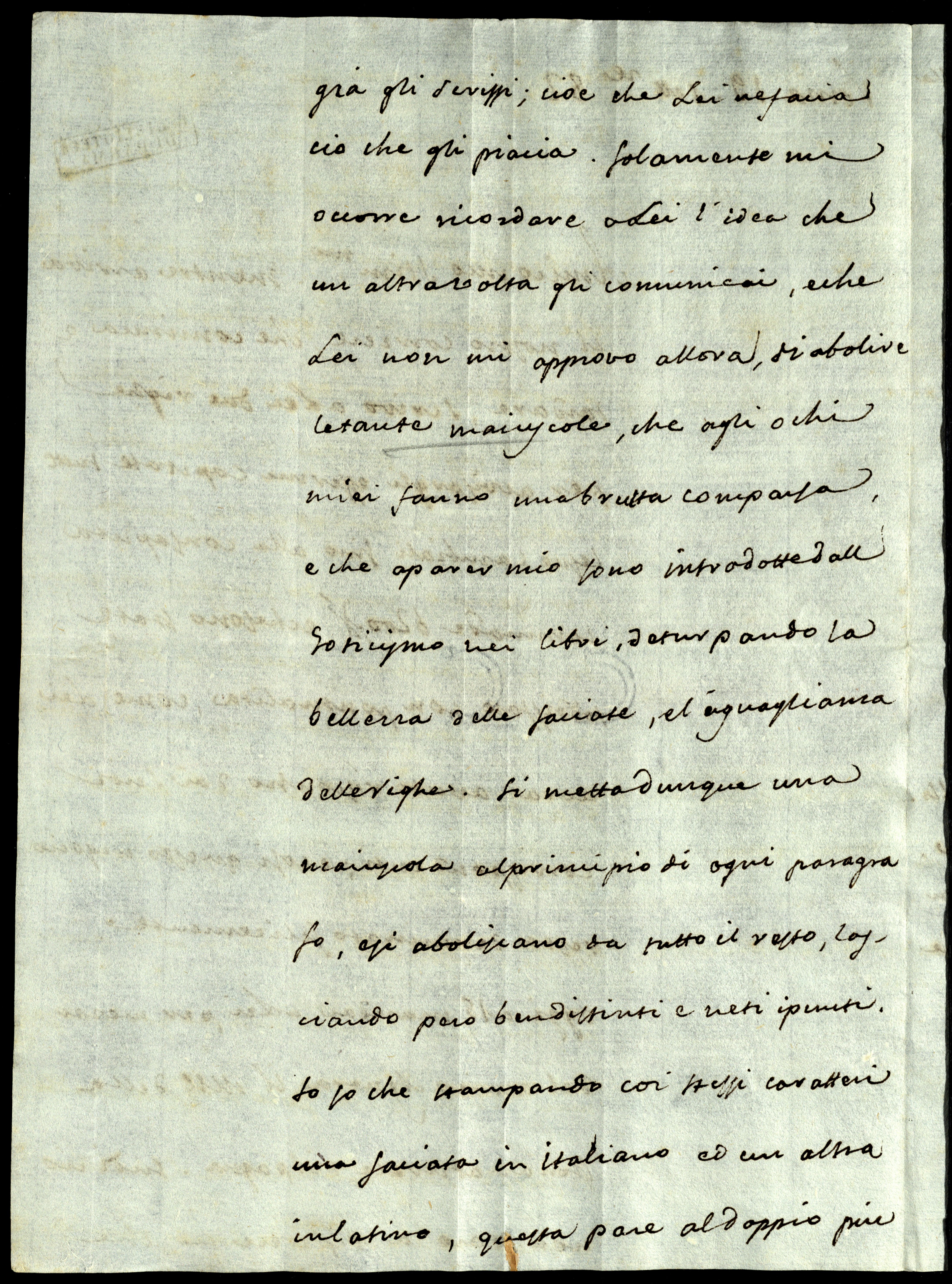 Oggi a 15 mandai a Lei per mezzo del amico Agüera il manoscritto della storia naturale di Spagna. Su di ciò non starò a ripetere ciò che già gli scrissi; cioè che Lei ne facia ciò che gli piacia. Solamente mi occorre ricordare a Lei l’idea, che un’altravolta gli comunicai. e che Lei non mi approvò allora, di abolire le tante maiuscole che agli ochi miei fanno una brutta comparsa e che, a parer mio, sono introdotte dall goticismo nei libri, deturpando la bellezza delle faciate e l’uguaglianza delle righe. Si metta dunque una maiuscola al principio di ogni paragrafo e si aboliscano da tutto il resto, lasciando però ben distinti e neti i punti.