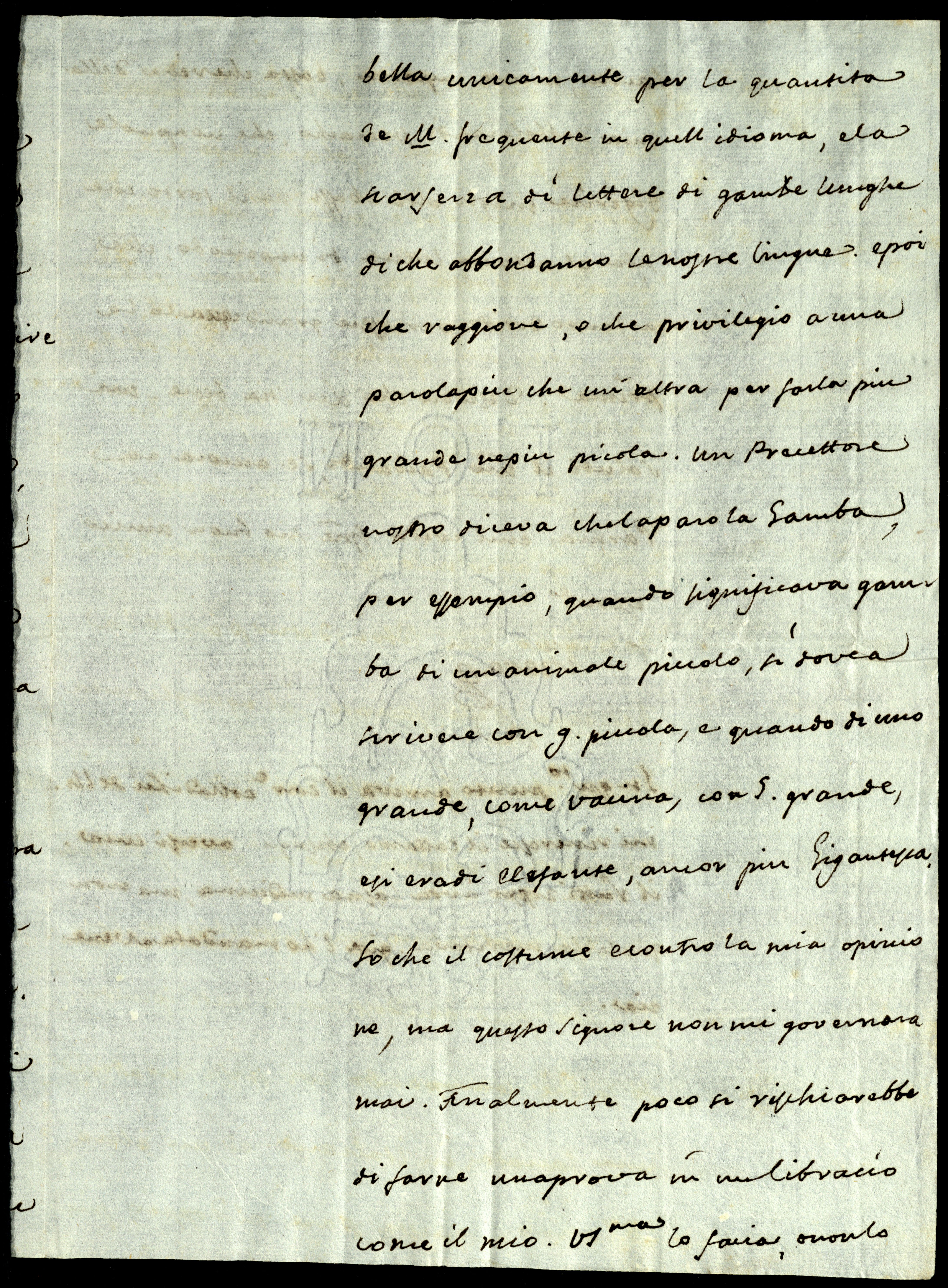Io so che stampando coi stessi caratteri una faciata in italiano ed un’altra in latino, questa pare al doppio più bella unicamente per la quantità de M frequente in quell’idioma e la scarsezza di lettere di gambe lunghe di che abbondanno le nostre lingue. E poi, che raggione o che privilegio ha una parola più che un’altra per farla più grande né più picola. Un precettore nostro diceva che la parola «Gamba», per essempio, quando significava gamba di un animale piccolo si dovea scrivere con g piccola e quando di uno grande, come vacina, con G grande; e si era di elefante, ancor più gigantesca. So che il costume è contro la mia opinione, ma questo signore non mi governarà mai. Finalmente poco si rischiarebbe di farne una prova in un libracio come il mio. Vostra Signoria lo facia o non lo facia, niente importa; basta che veda della mia debbolezza di stomacho che non puole digerire quegli alti e bassi, né il torto che si fa al’ultima lettera di un periodo, che ha tanto diritto per essere grande quantoa la prima.