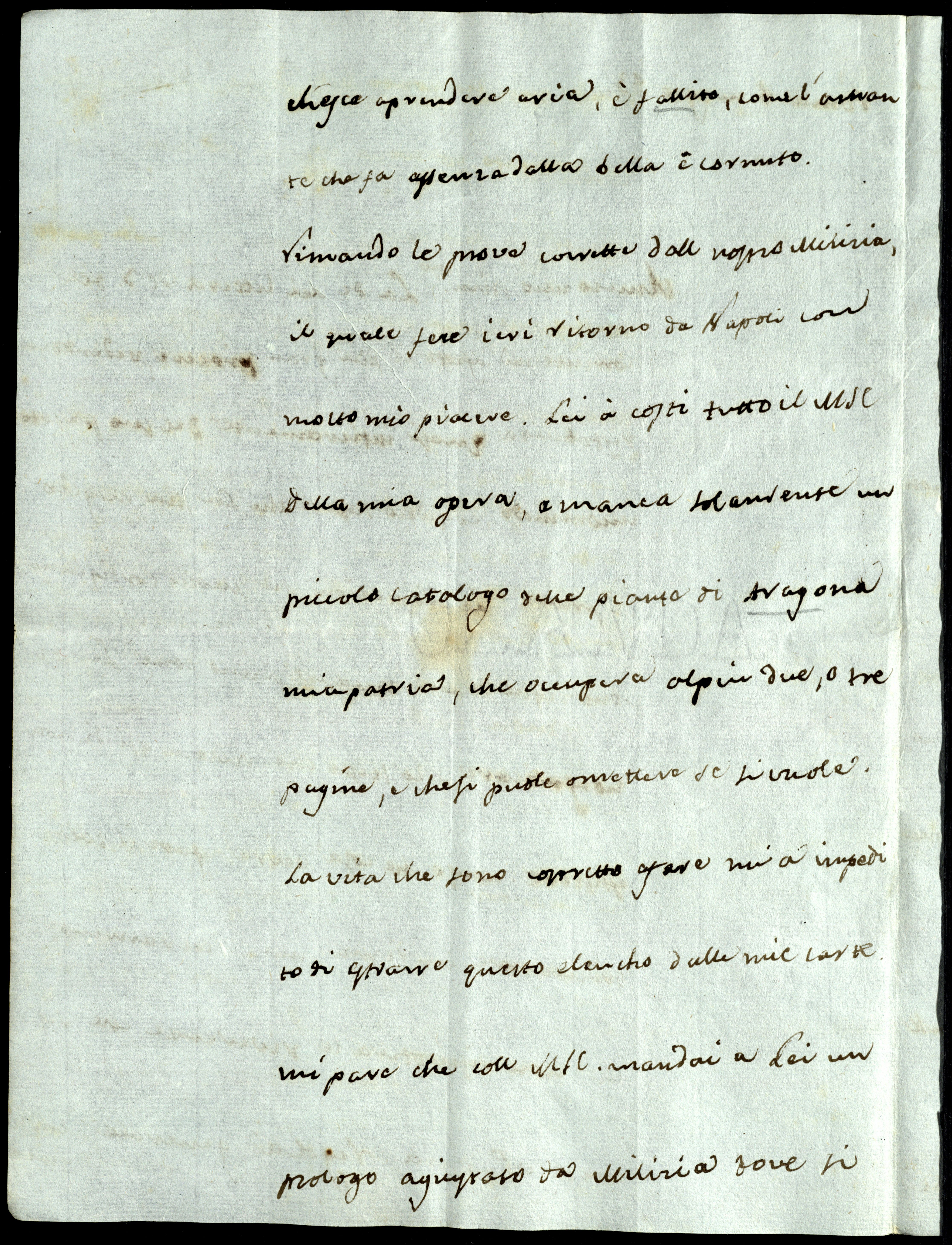 Rimando le prove corrette dall nostro Milizia, il quale fece ieri ritorno da Napoli con molto mio piacere. Lei ha costì tutto il manoscritto della mia opera e manca solamente un piccolo catalogo delle piante di Aragona, mia patria, che occuperà al più due o tre pagine e che si puole omettere se si vuole.