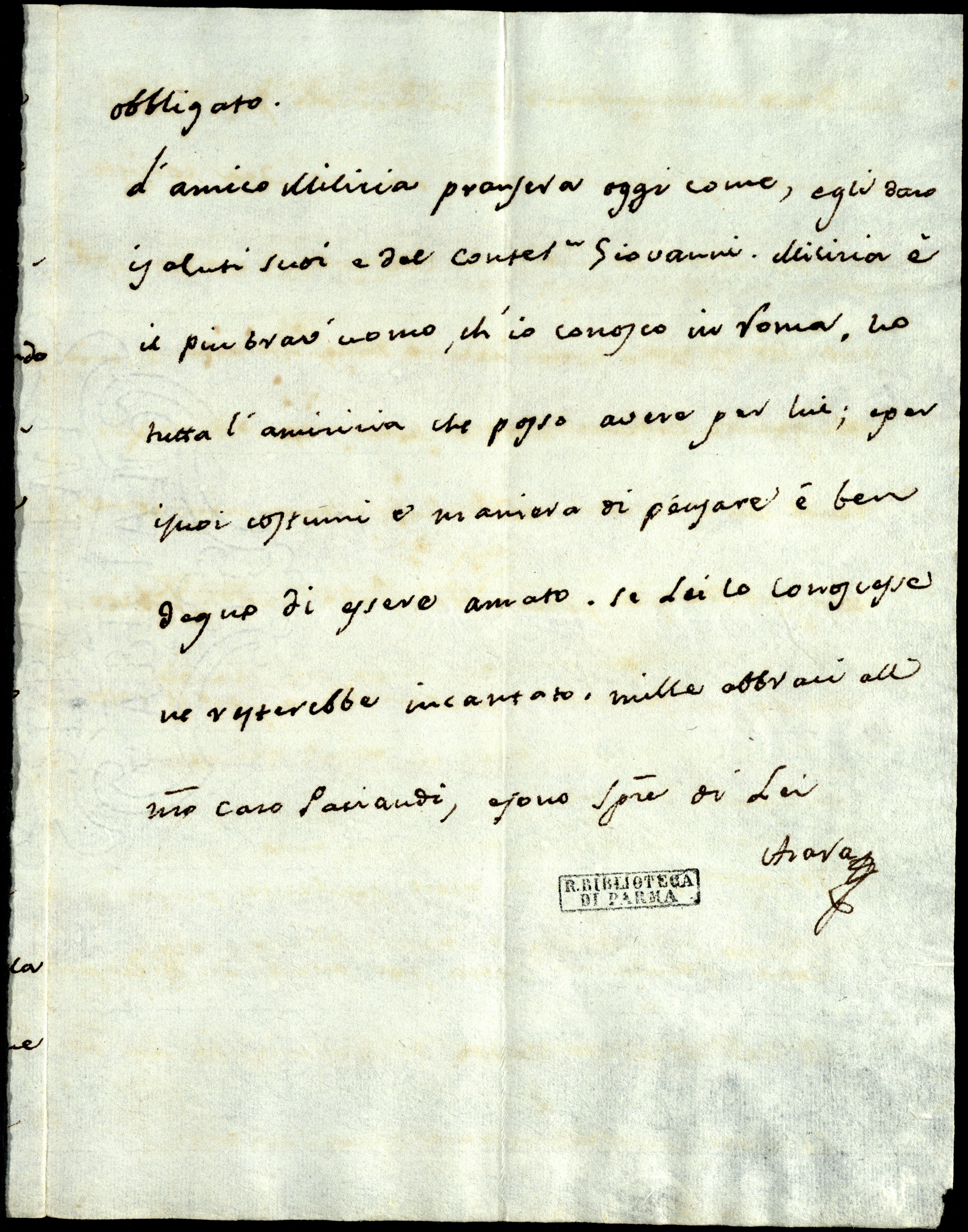 L’amico Milizia pranserà oggi co[n] me e gli darò i saluti Suoi e dal Conte Sangiovanni. Milizia è il più brav’uomo ch’io conosco in Roma. Ho tutta l’amicizia che posso avere per lui e, per i suoi costumi e maniera di pensare, è ben degno di essere amato. Se Lei lo conoscesse ne resterebbe incantato.