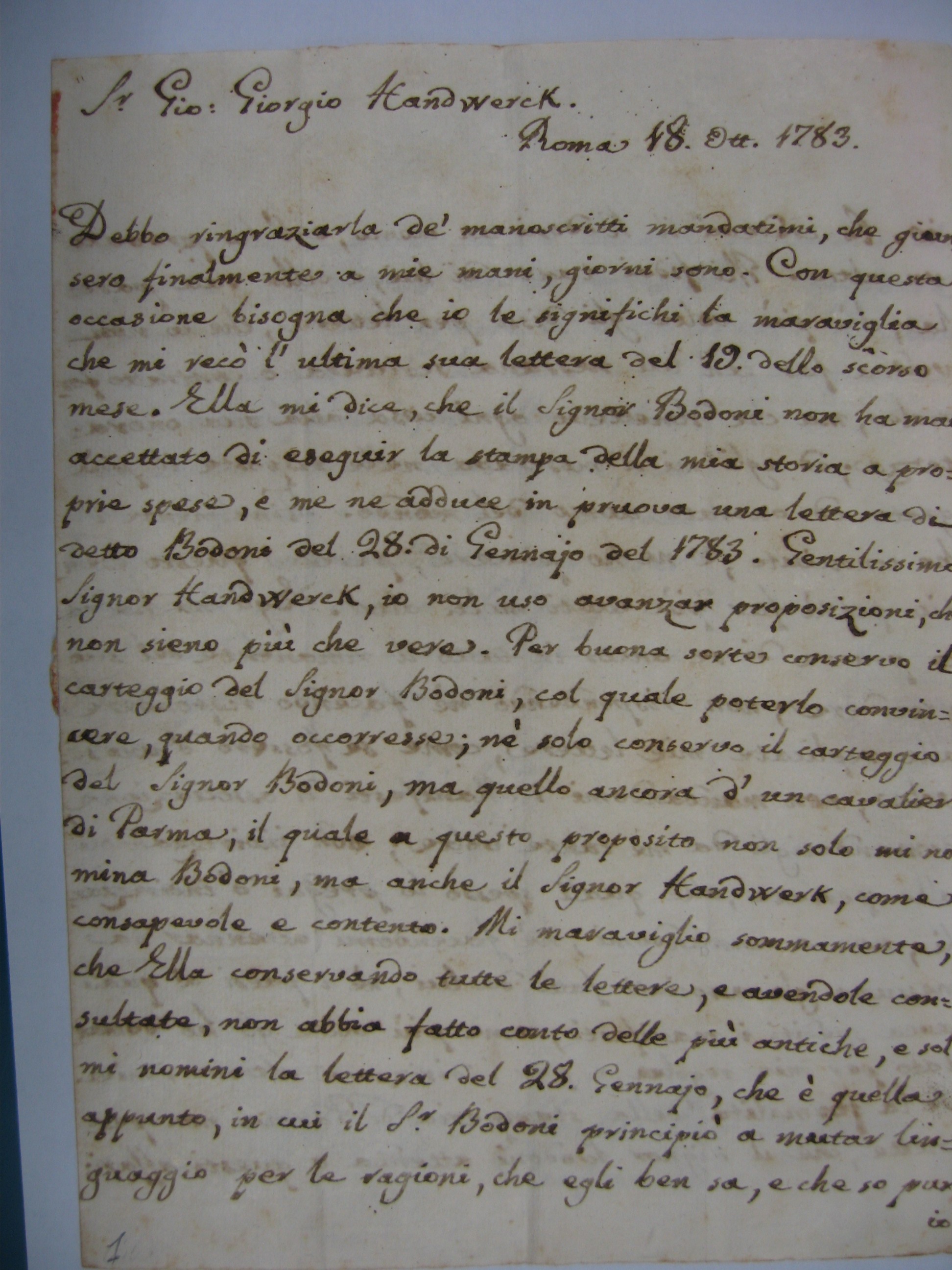 Debbo ringraziarLa de’ manoscritti mandatimi, che giunsero finalmente a mie mani giorni sono. Con questa occasione bisogna che io Le significhi la maraviglia che mi recò l’ultima sua lettera del 19 dello scorso mese. Ella mi dice che il Signor Bodoni non ha mai accettato di eseguir la stampa della mia Storia a proprie spese, e me ne adduce in pruova una lettera di detto Bodoni del 28 di gennaio del 1783. Gentilissimo Signor Handwerk, io non uso avanzar proposizioni che non sieno più che vere. Per buona sorte conservo il carteggio del Signor Bodoni, col quale poterlo convincere quando occorresse. Né solo conservo il carteggio del Signor Bodoni, ma quello ancora d’un cavalier di Parma, il quale a questo proposito non solo mi nomina Bodoni ma anche il Signor Handwerk come consapevole e contento. Mi maraviglio sommamente che Ella, conservando tutte le lettere e avendole consultate, non abbia fatto conto delle più antiche, e sol mi nomini la lettera del 28 gennaio, che è quella appunto in cui il signor Bodoni principiò a mutar liguaggio per le ragioni che egli ben sa e che so pur io.