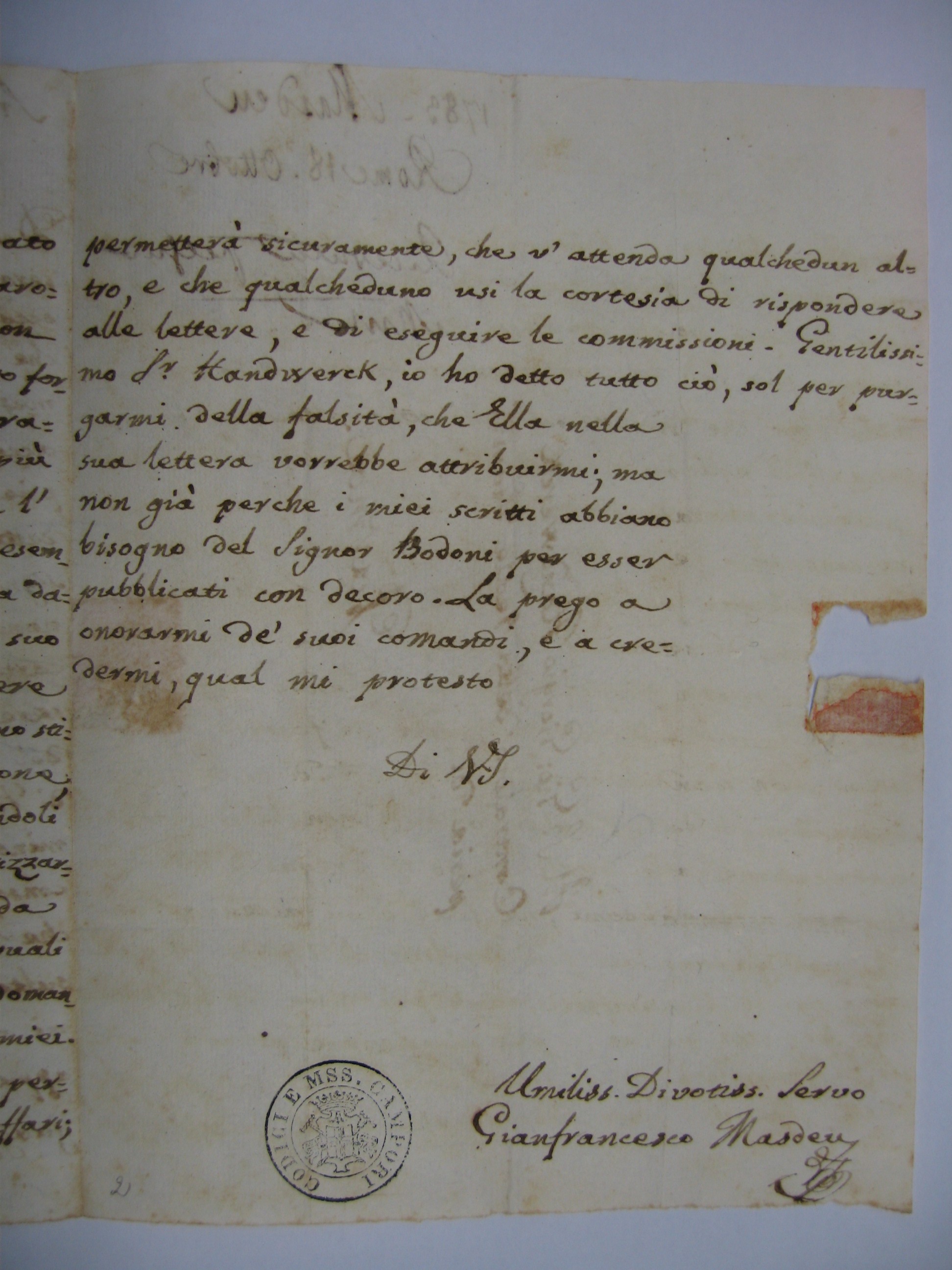 Gentilissimo Signor Handwerck, io ho detto tutto ciò sol per purgarmi della falsità che Ella nella Sua lettera vorrebbe attribuirmi, ma non già perché i miei scritti abbiano bisogno del Signor Bodoni per esser pubblicati con decoro.