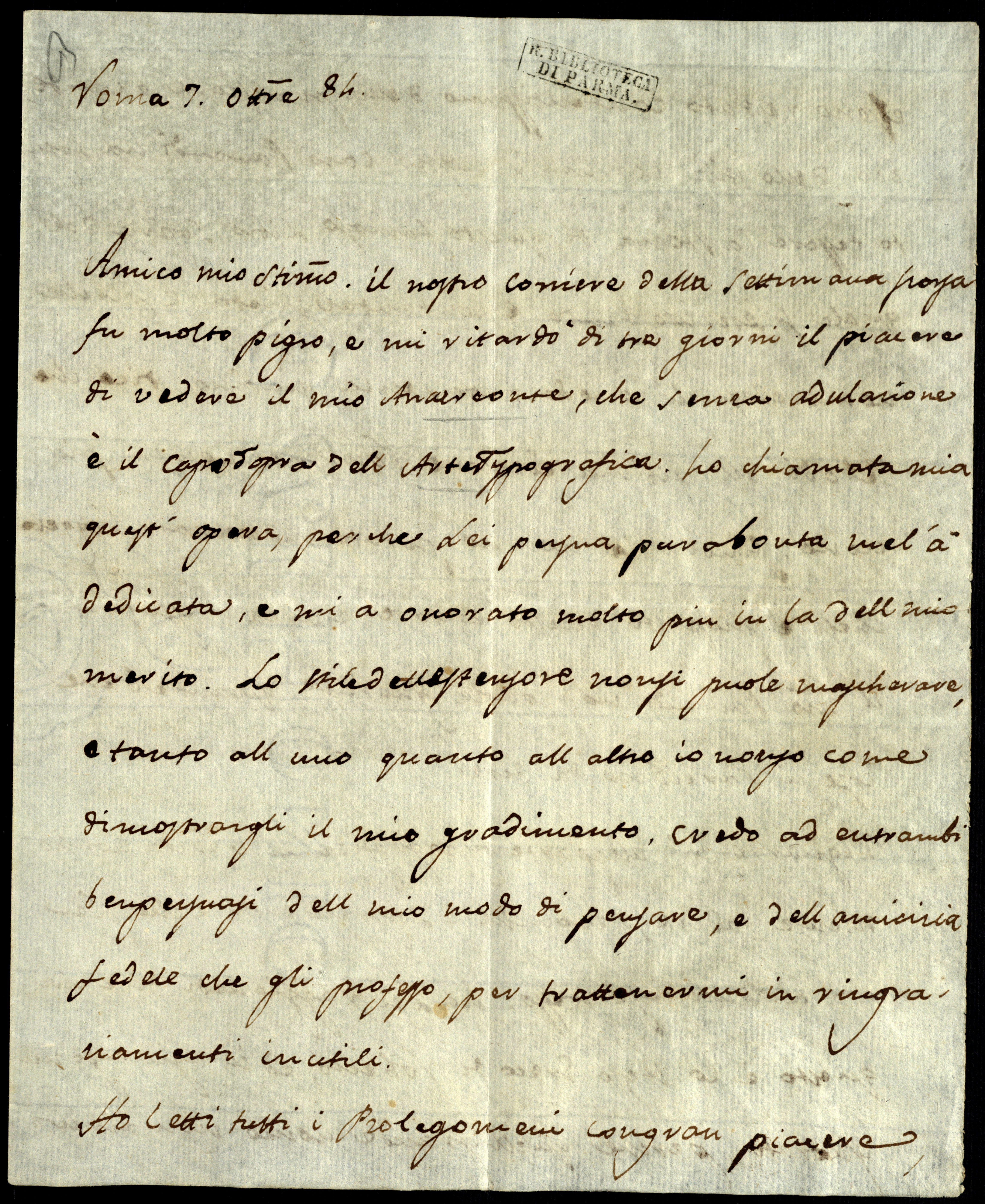 Il nostro corriere della settimana scorsa fu molto pigro e mi ritardò di tre giorni il piacere di vedere il mio Anacreonte, che, senza adulazione, è il capodopra dell’arte typografica. Ho chiamata mia quest’opera perché Lei, per Sua pura bontà, me l’ha dedicata e mi ha onorato molto più in là dell mio merito. Lo stile dell’estensore non si puole mascherare e, tanto all’uno quanto all’altro, io non so come dimostrargli il mio gradimento. Credo ad entrambi ben persuasi dell mio modo di pensare e dell’amicizia fedele che gli professo per tratternermi in ringraziamenti inutili.