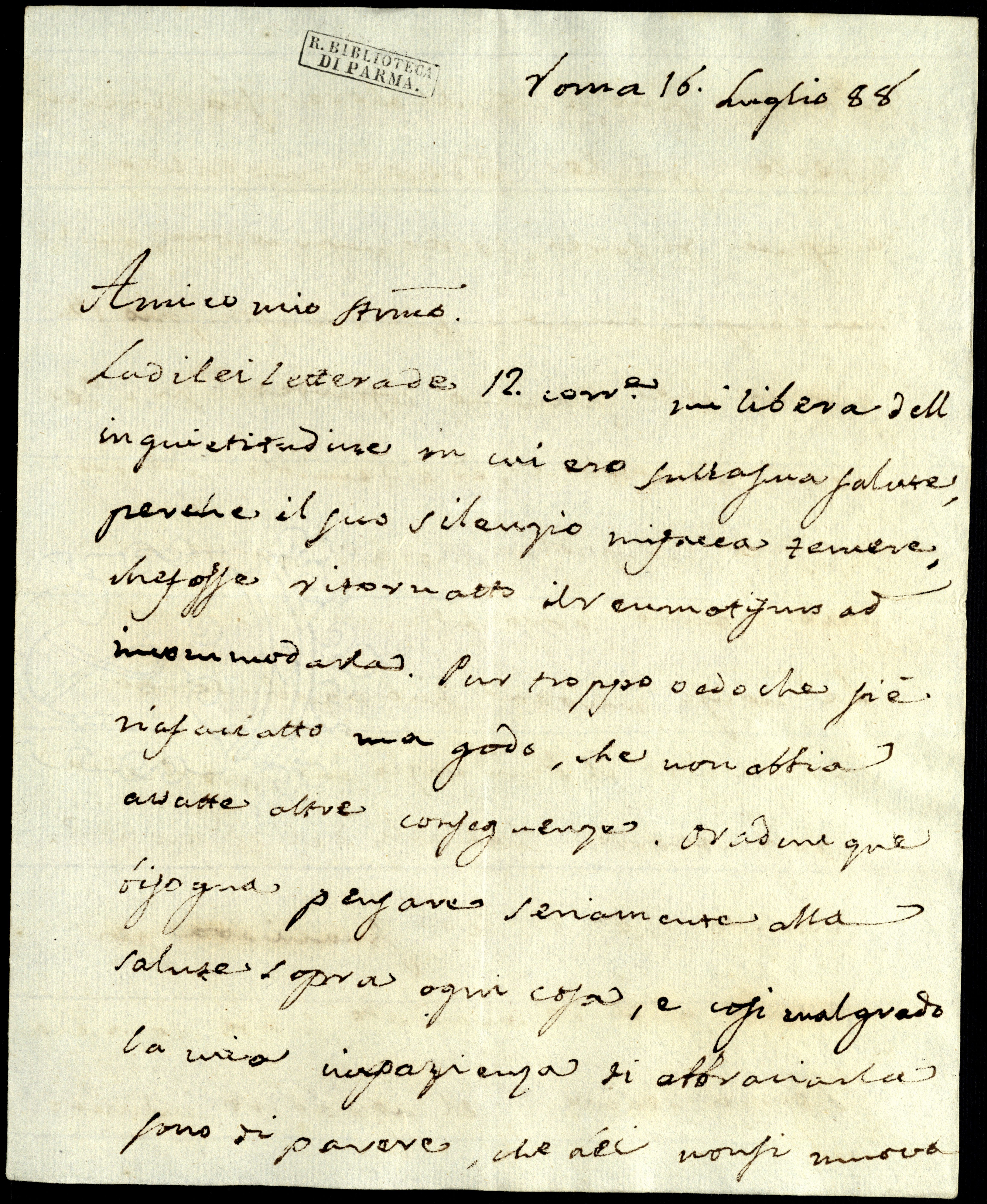 Ora duncque [sic] bisogna pensare seriamente alla salute sopra ogni cosa e così, malgrado la mia impazienza di abbraciarLa, sono di parere che Lei non si muova da Parma fino a che il calore sia meno intenso, poiché addesso è insoffribile e capace di fare forte impressione anche sui temperamenti i più robusti. Sono 15 giorni che siammo costantemente su i 40 gradi all’ombra ed è temible che crescerà fino a doppo la metà d’agosto, come fece l’anno scorso. Fissiammo dunque che Lei non si muova fino a quel tempo.
