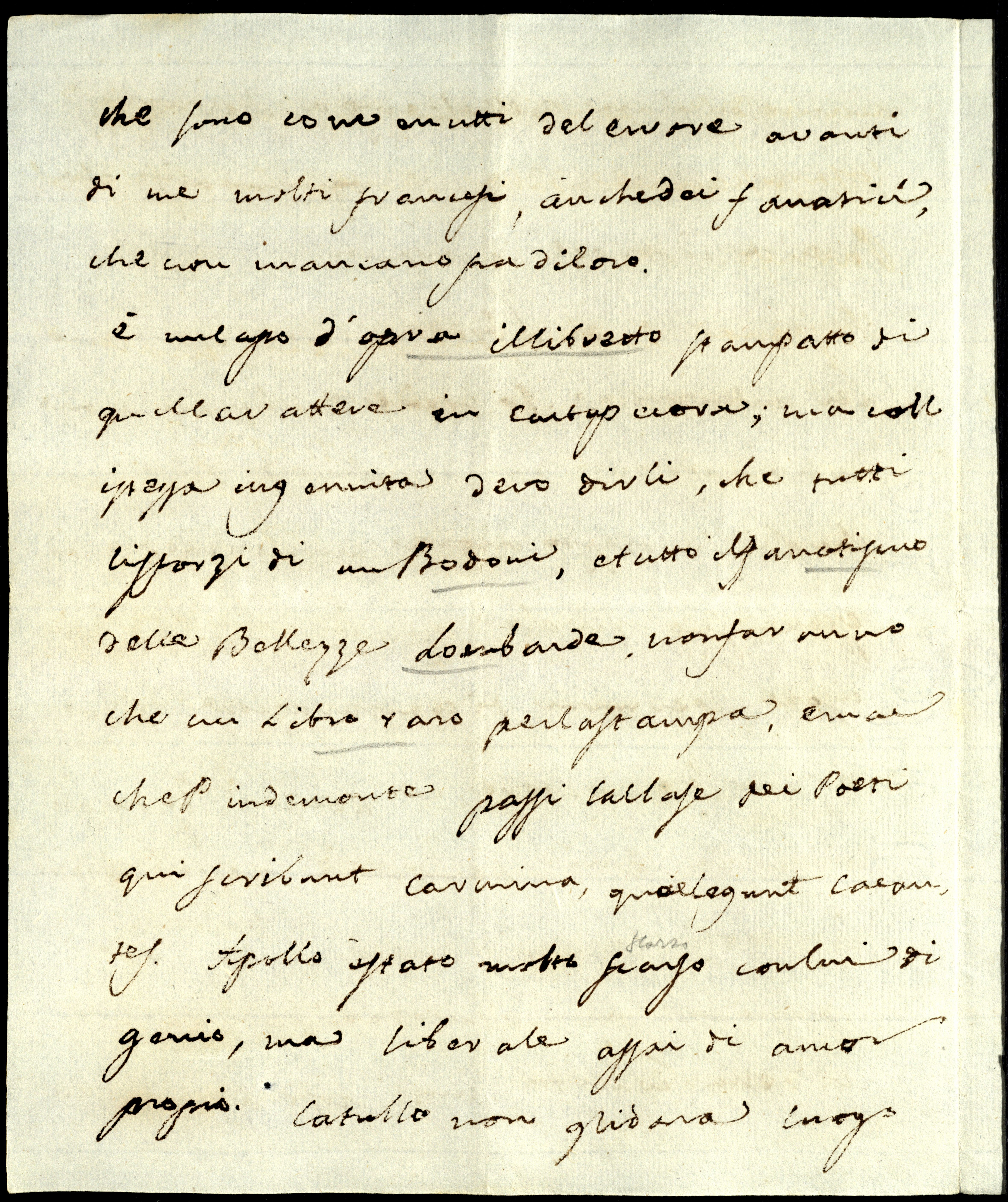 Ho ricevutto il Prudenzio in carta scelta e non occorre che parli del’edizione. Come so che il Papa smaniava per averlo, gliel’ho mandato subito com’era, senza legare, e l’ha gradito infinito diffondendosi in elogi sterminati di Bodoni. Non sarà così prodigo di lodi de Teuli, perché costui passa per un tantin giansenista e questa puzza offende troppo il naso di Sua Santità e compagnia. Il suddetto Teuli si vergogna di vedere il Suo libro correre per le mani di molti e non averlo lui.