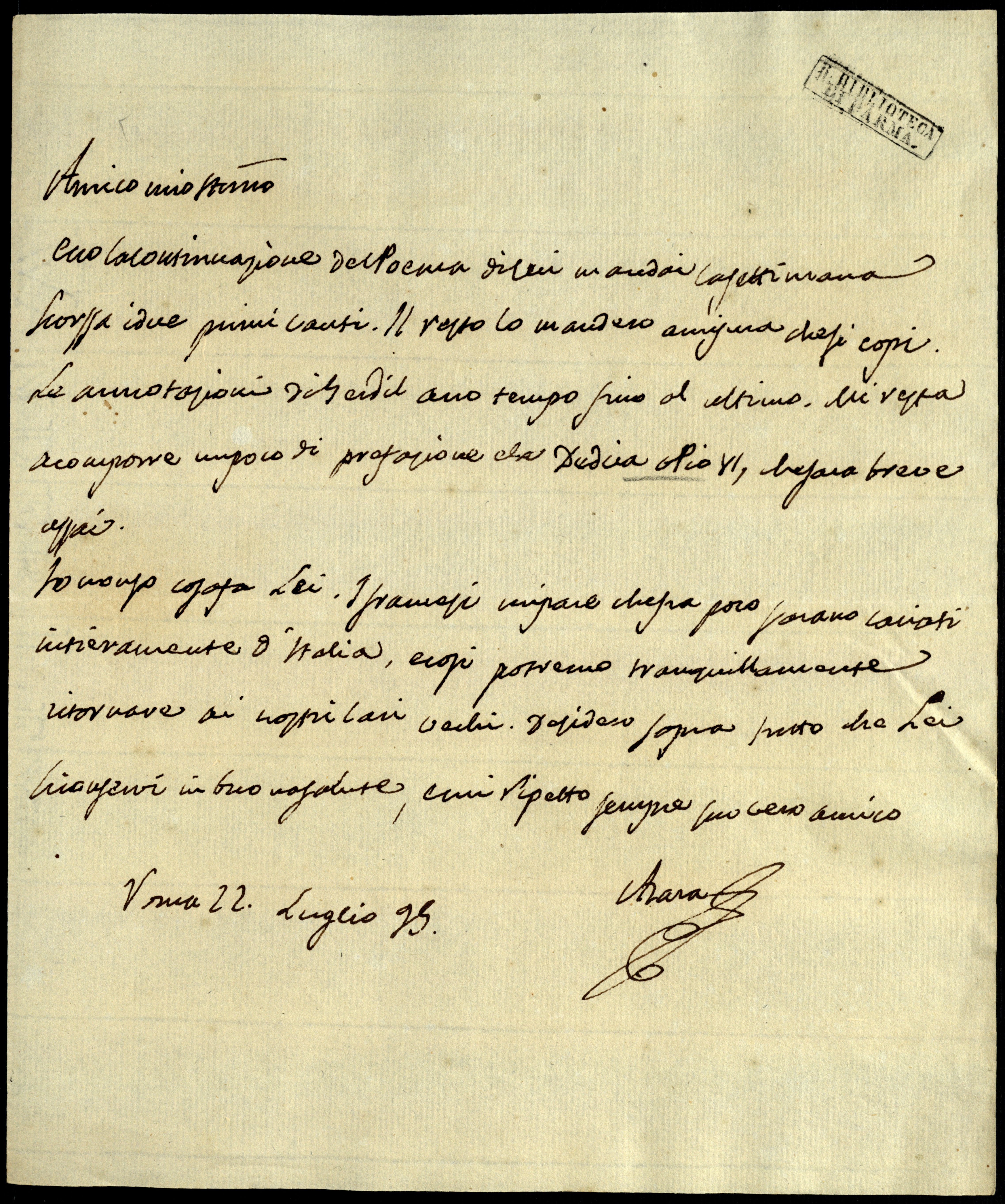 Roma, 22 de julio de 1795. De José Nicolás de Azara [Roma] a Giambattista Bodoni [Parma].