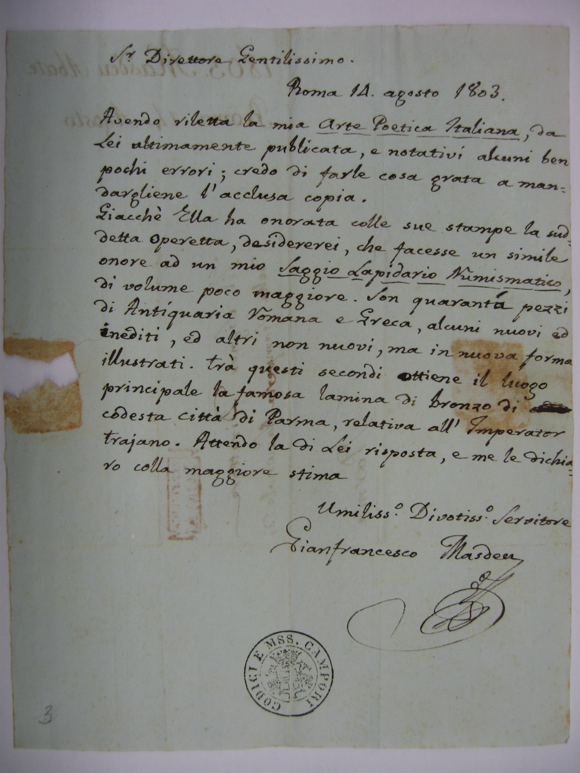 Giacché Ella ha onorata colle sue stampe la suddetta operetta, desidererei che facesse un simile onore ad un mio Saggio lapidario numismatico, di volume poco maggiore. Son quaranta pezzi di antiquaria romana e greca, alcuni nuovi ed inediti, ed altri non nuovi, ma in nuova forma illustrati. Tra questi secondi ottiene il luogo principale la famosa lamina di bronzo di codesta città di Parma, relativa all’imperator Traiano.