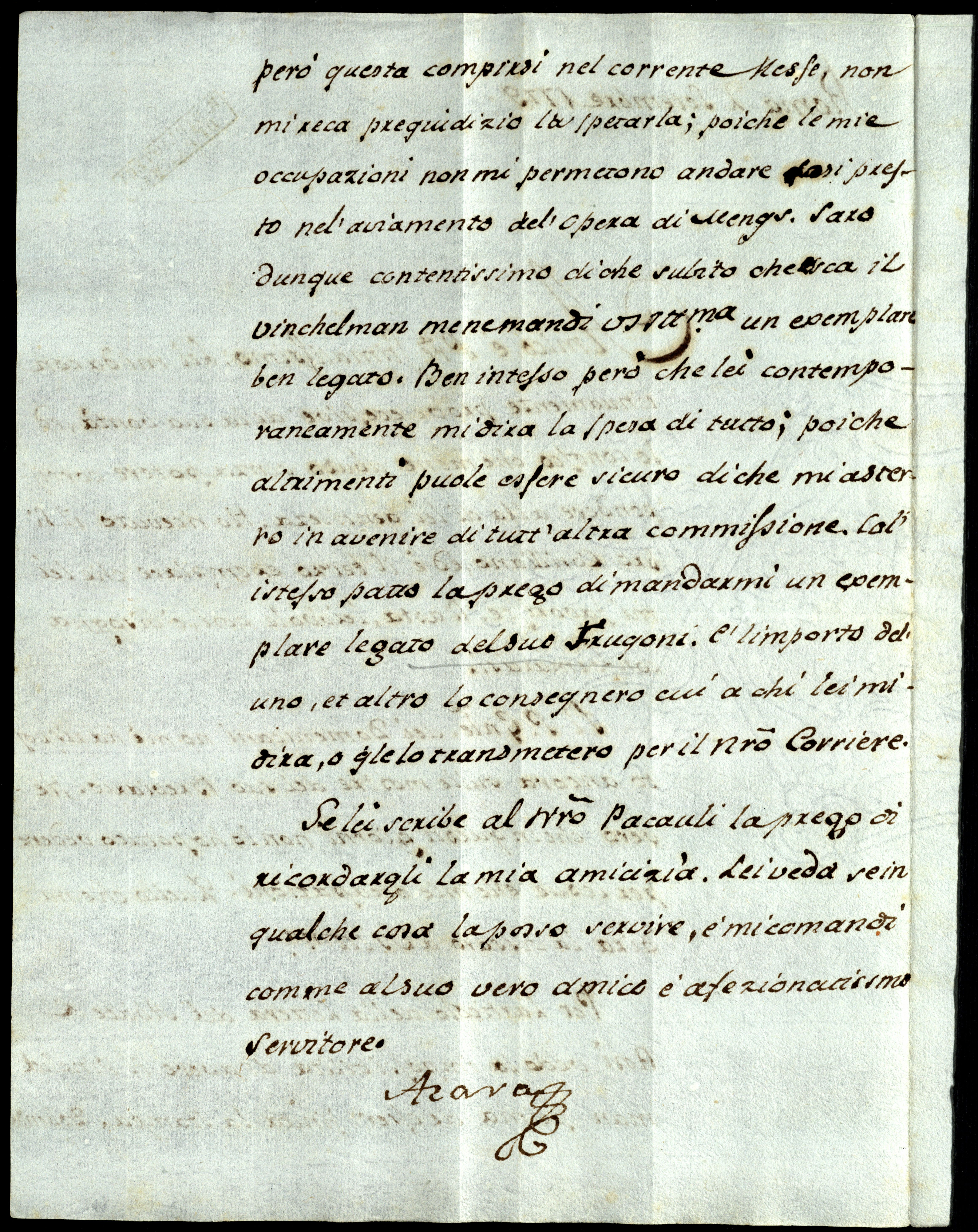 Per l’articolo della lettera del’Abate de Ro[s]si vedo la impossibilità di avere il Vinchelman prima de esser finita la stampa. Dobendo però questa compirsi nel corrente messe, non mi reca pregiudizio l’aspetarla, poiché le mie occupazioni non mi permetono andare così presto nel’aviamento del’opera di Mengs. Sarò dunque contentissimo di che subito che essca il Vinchelman me ne mandi Vostra Signoria Illustrissima un exemplare ben legato, ben intesso però che Lei contemporaneamente mi dirà la spesa di tutto, poiché altrimenti puole essere sicuro di che mi asterrò in avenire di tutt’altra commissione. Col’istesso patto La prego di mandarmi un exemplare legato del Suo Frugoni e l’importo del’uno et altro lo consegnerò cui a chi Lei mi dirà, o gl[i]elo transmeterò per il nostro corriere.