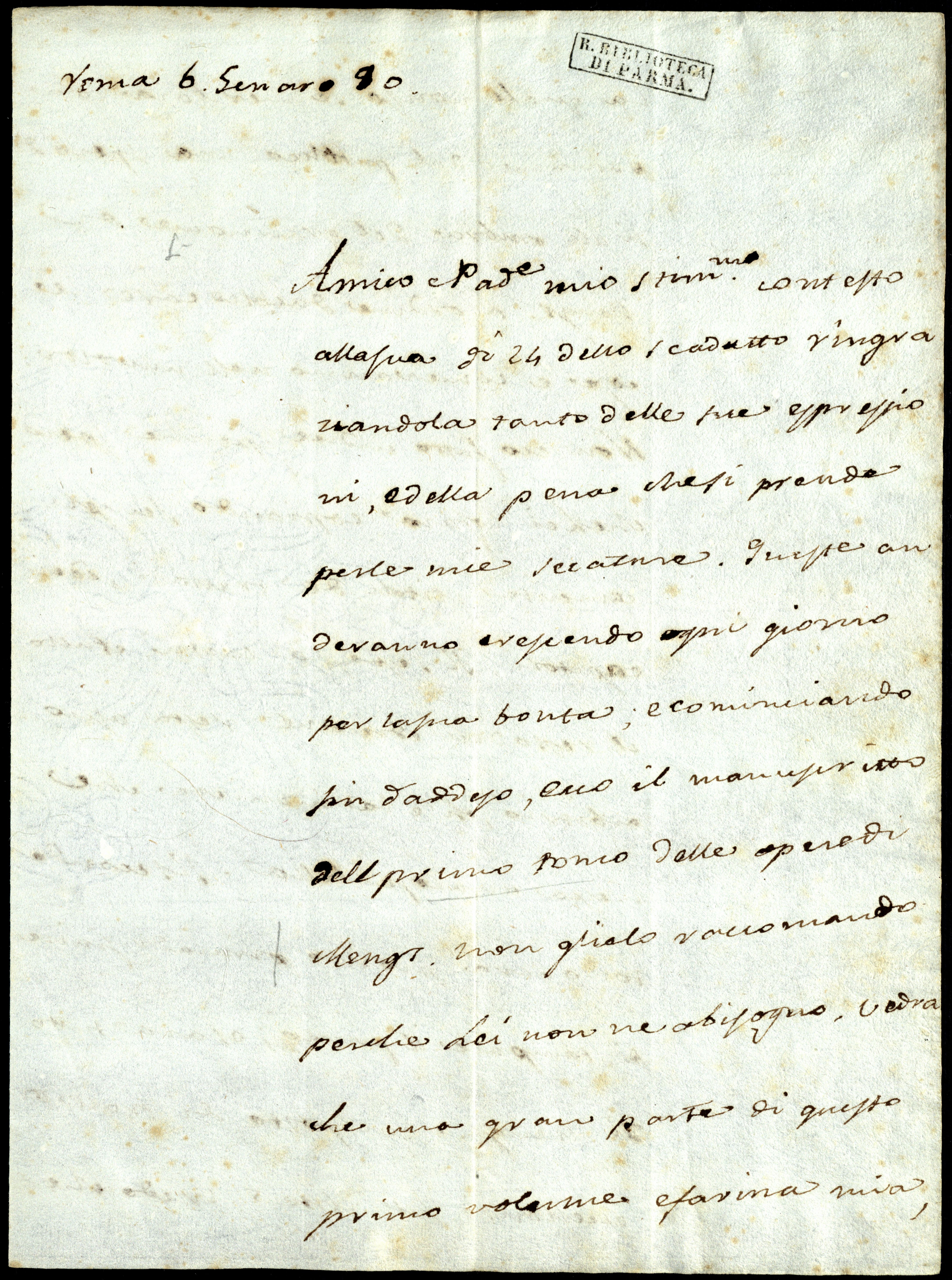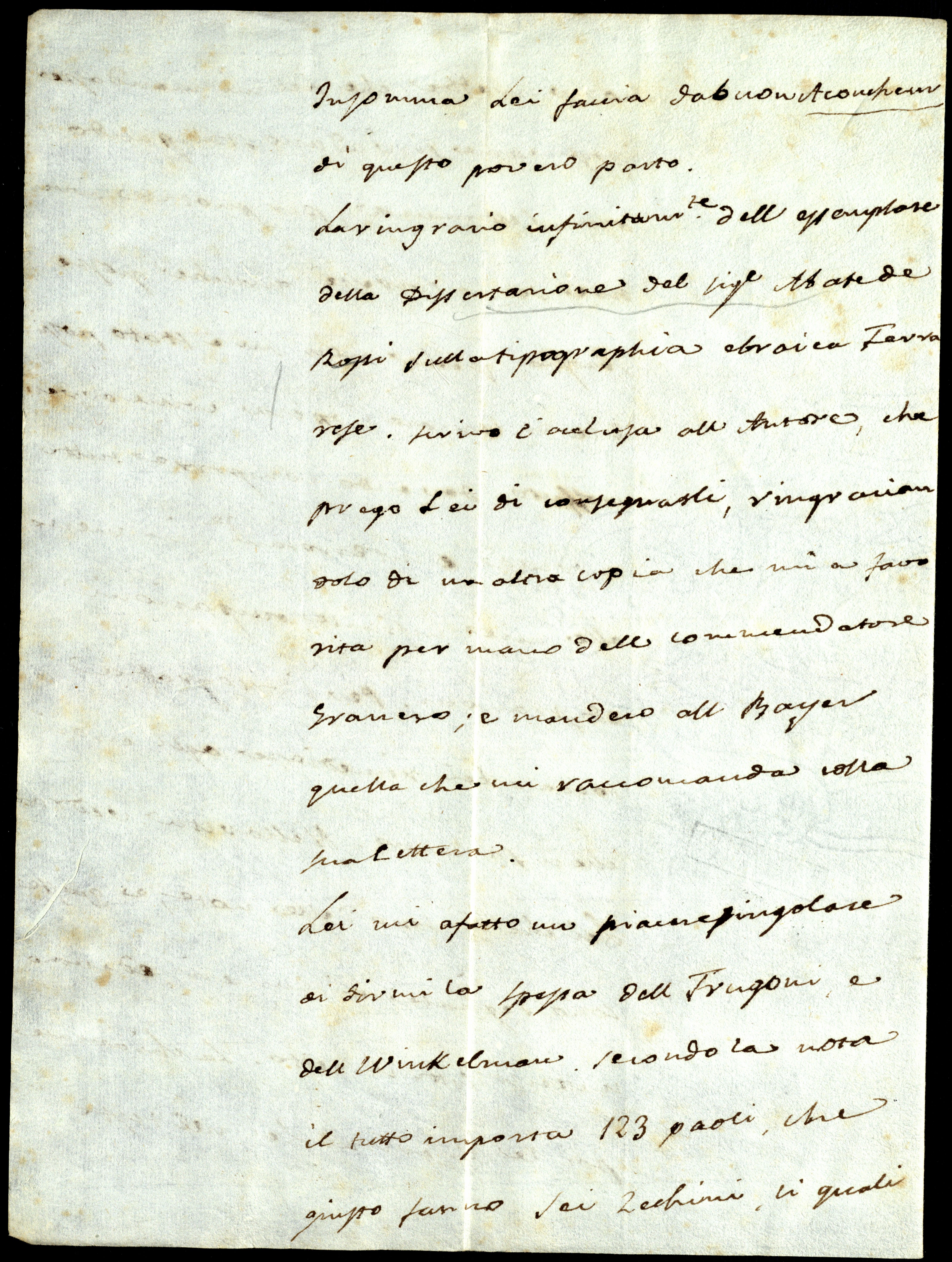 La ringrazio infinitamente dell’essemplare della dissertazione del Signor Abbate de Rossi sulla tipographia ebraica ferrarese. Scrivo l’acclusa all’autore, che prego Lei di consegnarli, ringraziandolo di un’altra copia che mi ha favorita per mano dell Commendatore Granero; e manderò all Bayer quella che mi raccomanda colla Sua lettera.