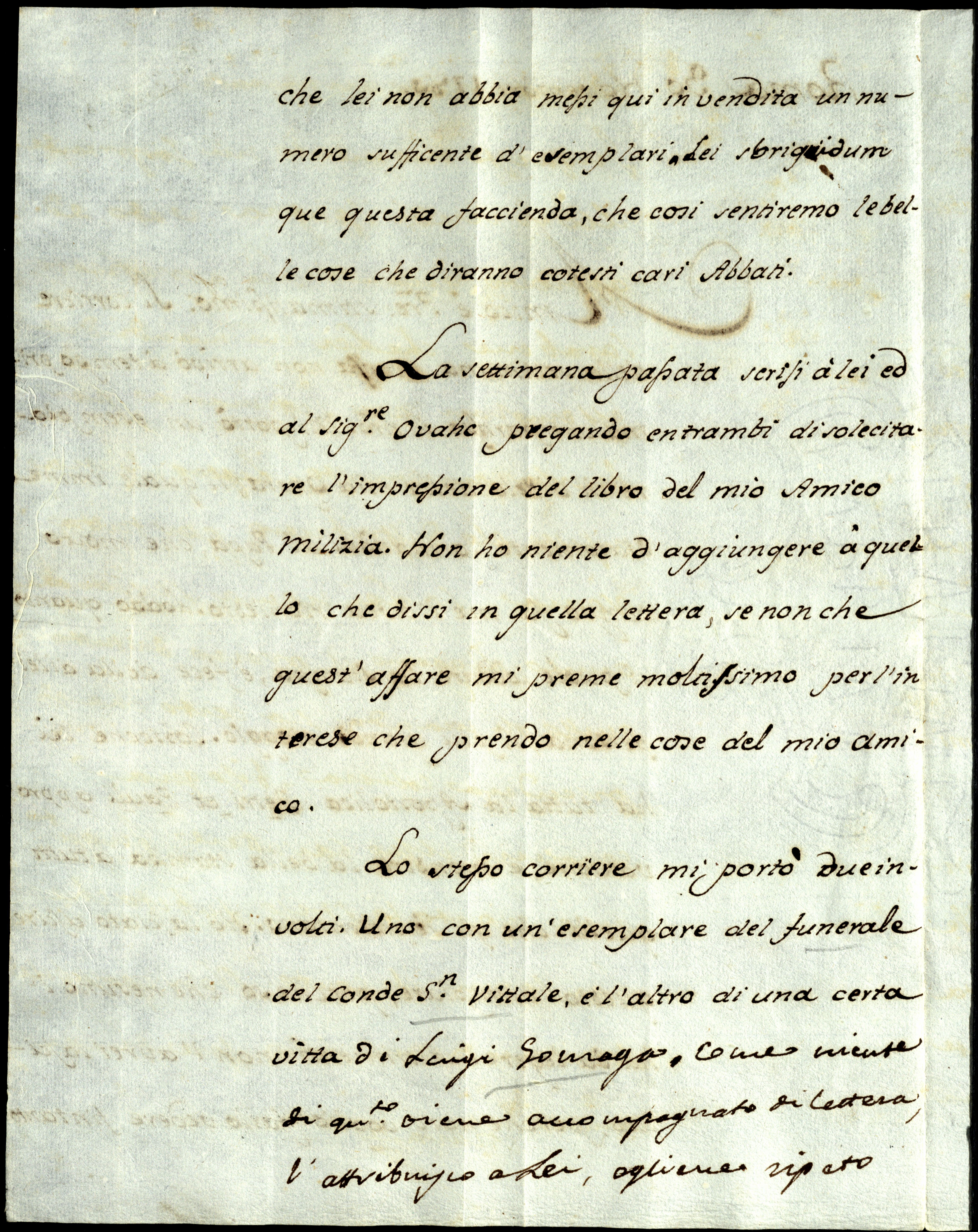 Lo stesso corriere mi portò due involti: uno con un esemplare del funerale del Conde Sanvittale e l’altro di una certa vitta di Luigi Gonzaga . Come niente di questo viene accompagnato di lettera, l’attribuisco a Lei, a gliene ripeto i dovuti ringraziamenti.