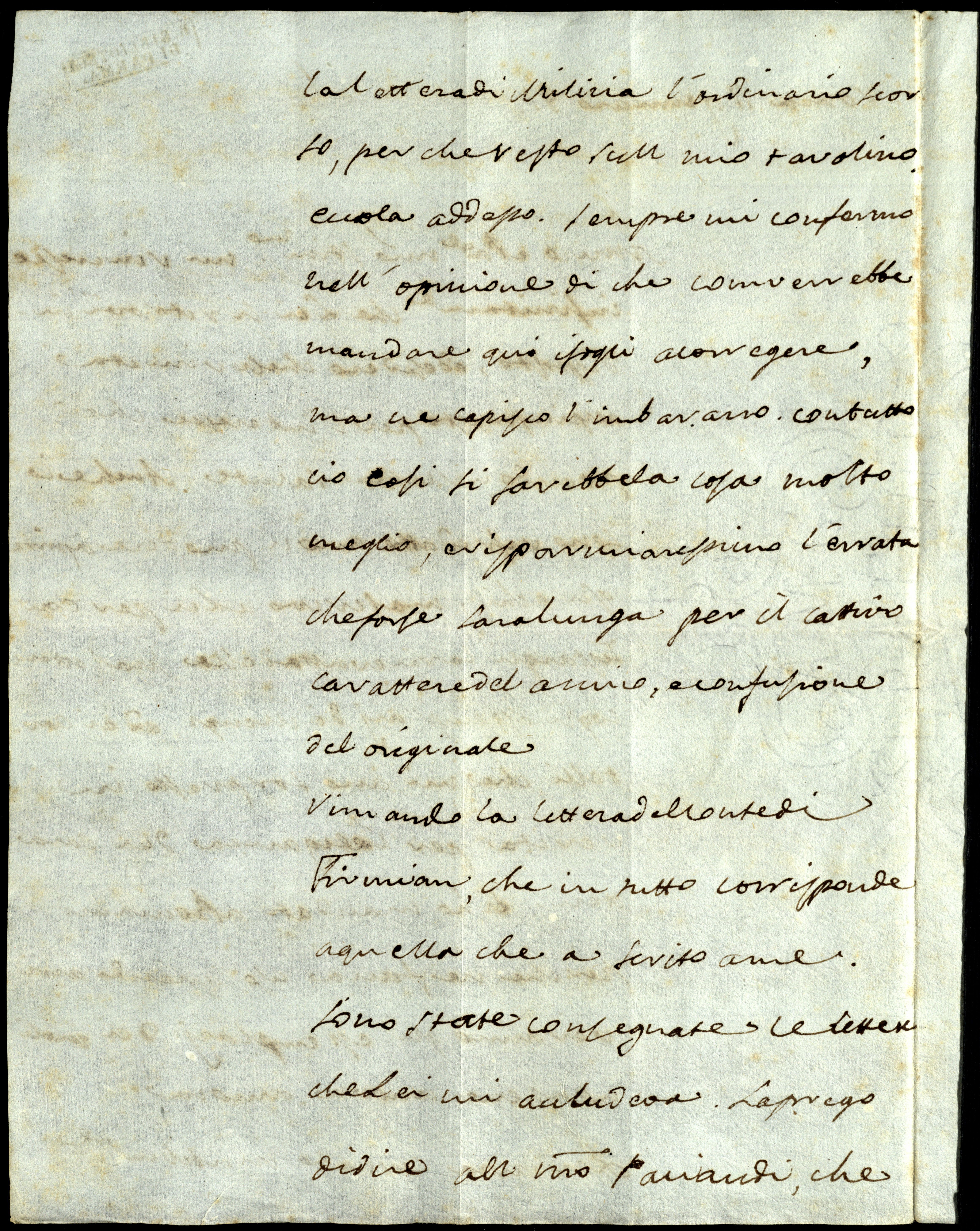 Lei avrà cercato inutilmente la lettera di Milizia l’ordinario scorso, perché restò sull mio tavolino. Eccola addesso. Sempre mi confermo nell’opinione di che comverrebbe mandare qui i fogli a corregere, ma ne capisco l’imbarazzo. Contuttociò, così si farebbe la cosa molto meglio e risparmiaressimo l’errata che forse sarà lunga per il cattivo carattere del’amico e confusione del’originale.