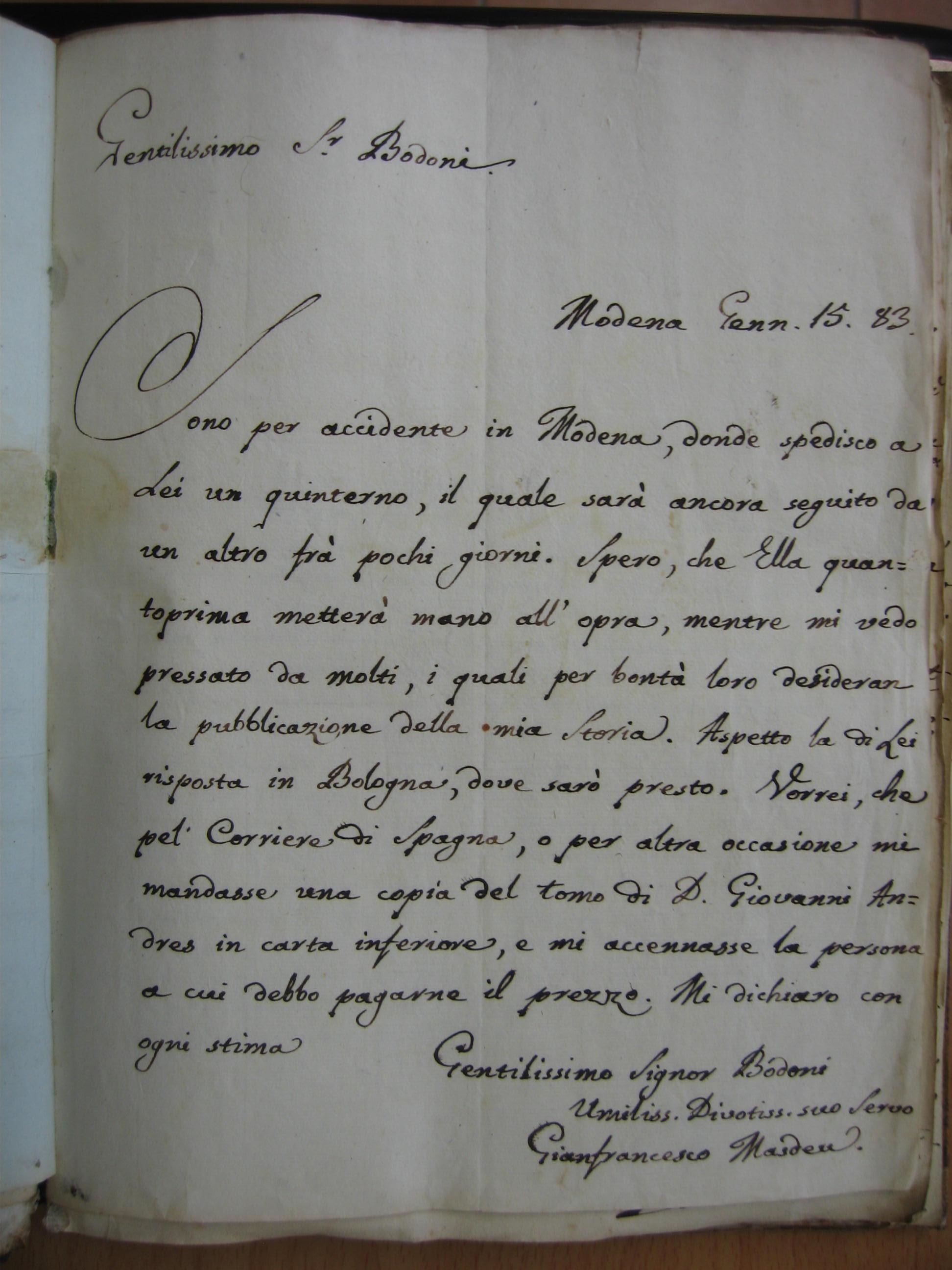 From Juan Francisco Masdeu [Modena] to Giambattista Bodoni [Parma].