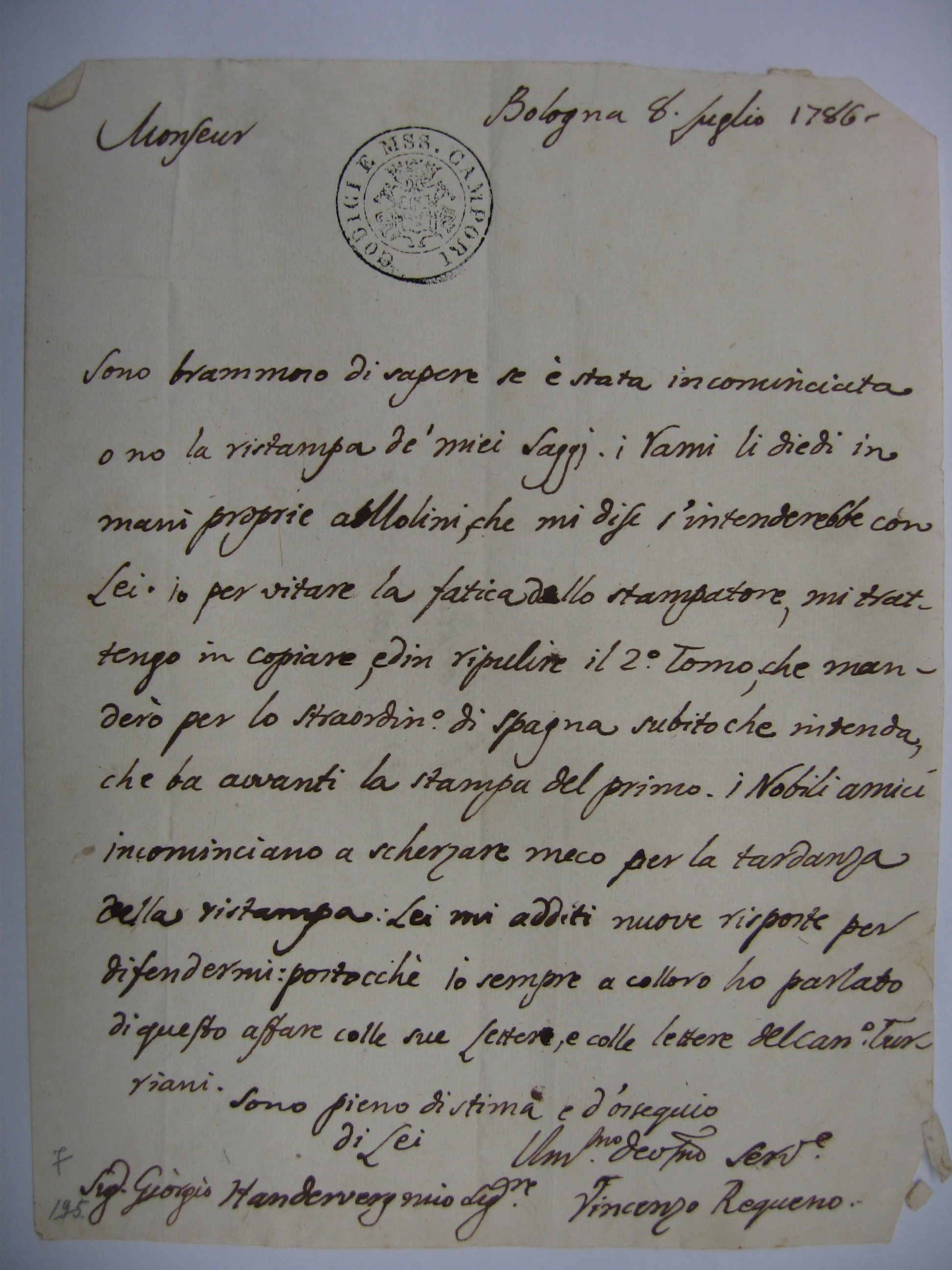 From Vicente Requeno [Bologna] to Hans Georg Handwerk [Parma].