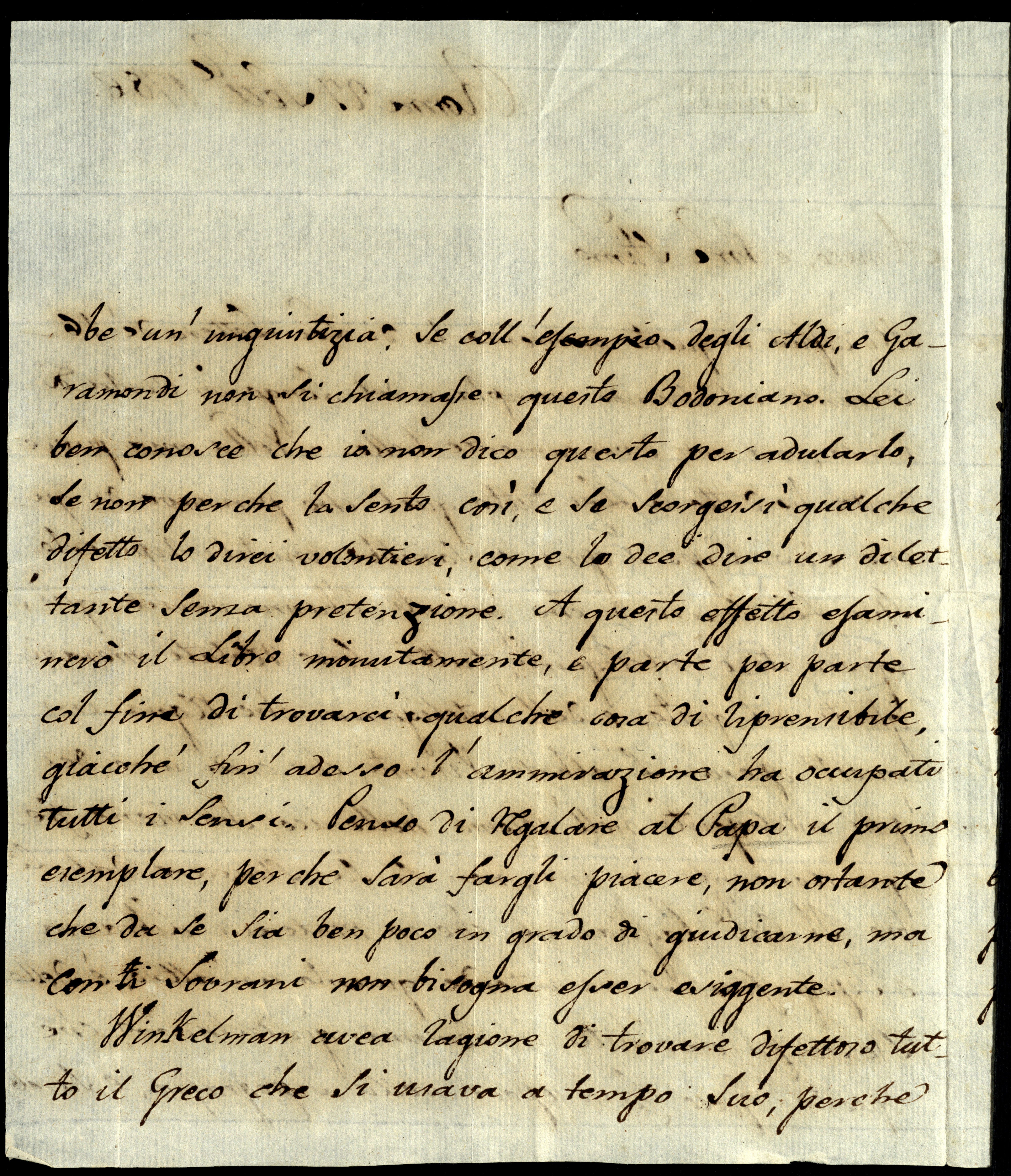 Nella mia precedente ho detto a Lei tutto quel che pensavo di questo Suo capo d’opra e sarebbe inutile ripeterlo. Stia Lei sicuro di che quanti l’hanno veduto qui, ignoranti e inteligenti, tutti sono restati meravigliati del gusto e dell’inteligenza che regna in quest’opera. L’Abbate Visconti, che credo uno dei più inteligenti nell’idioma hellenico, che viene frequentemente da me, non si sa staccare dal libro. Il Cavaliere Pagliarini, che in materia libraria e tipografica se ne intende quanto un altro, è dello stesso parere. Tutti insomma giudichiamo che questo greco farà epoca nella tipografia e sarebbe un’ingiustizia se coll’esempio degli aldi e garamondi non si chiamasse questo bodoniano. Lei ben conosce che io non dico questo per adularLo, se non perché la sento così, e se scorgessi qualche difetto lo direi volontieri, come lo dee dire un dilettante senza pretenzione.