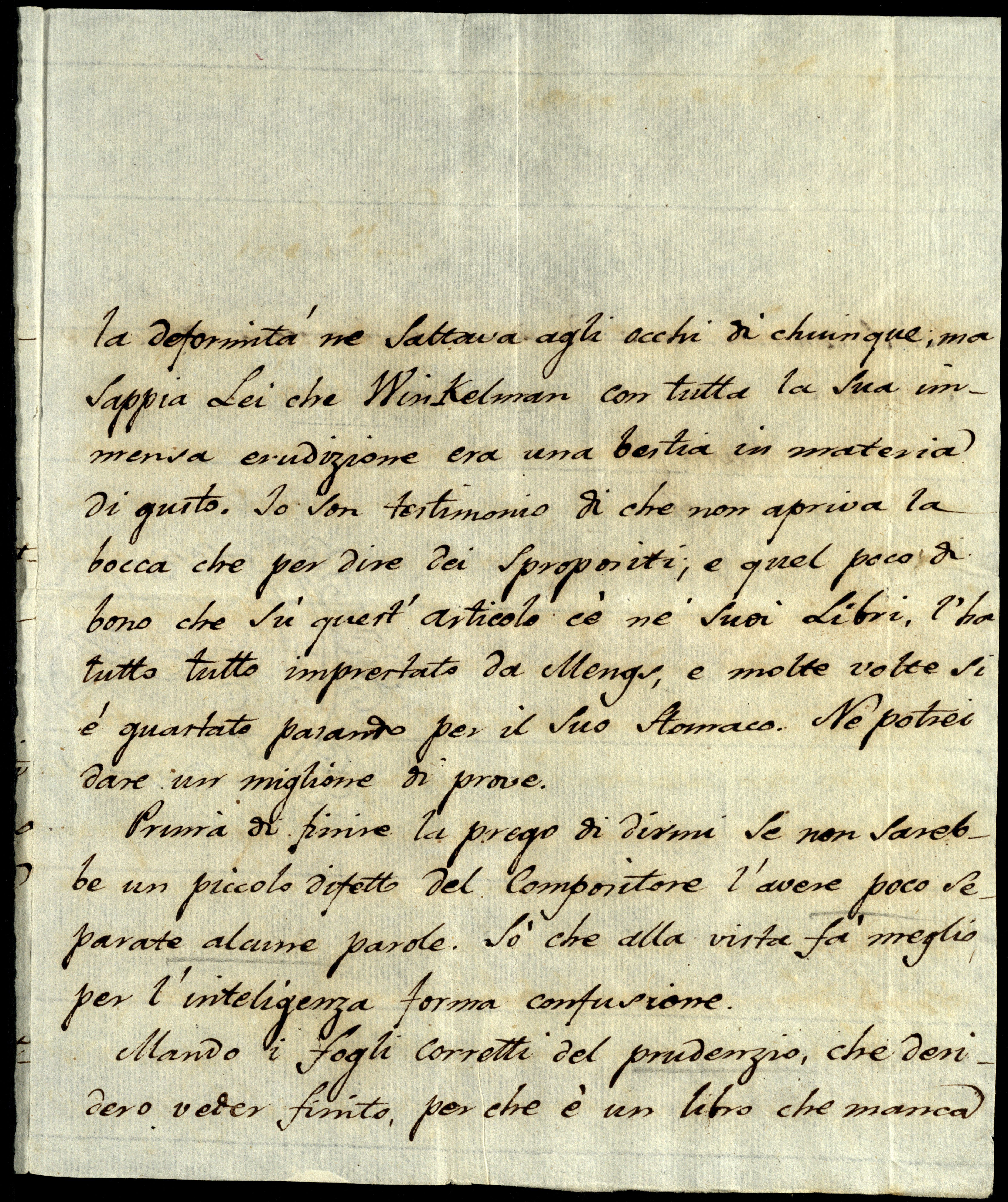Winkelman avea ragione di trovare difettoso tutto il greco che si usava a tempo suo, perché la deformità ne saltava agli occhi di chiunque. Ma sappia Lei che Winkelman, con tutta la sua immensa erudizione, era una bestia in materia di gusto. Io son testimonio di che non apriva la bocca che per dire dei spropositi e quel poco di bono che su quest’articolo c’è ne’ suoi libri, l’ha tutto tutto imprestato da Mengs, e molte volte si è guastato pasando per il suo stomaco. Ne potrei dare un miglione di prove.