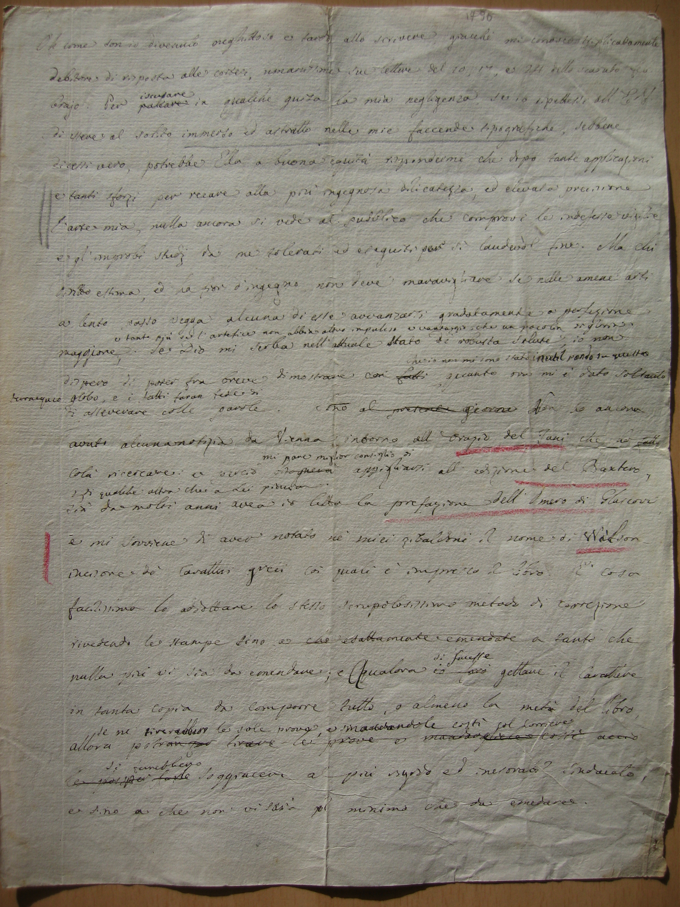 a iscusare añadido entre líneas sobre paliare cancelado. b e tanto più se l’artefice non abbia altro impulso e vantaggio che un poco la di gloria añadido entre líneas. c che io non mi sono stato inutil pondo su questo terracquio globo, e i fatti faran fede di añadido entre líneas sobre coi fatti cancelado. d Antes de non cancela Sono al presente giorno e mi pare miglior consiglio di añadido entre líneas sobre visognerà cancelado. f o di qualche altra che a Lei piaccia añadido entre líneas. g Había escrito Watson y corrige. h Antes de a cancela a che esattamente emendate i Antes de qualora cancela e sin tachar. k si facesse añadido entre líneas sobre io farò cancelado. l Había escrito tirerano y corrige. m se ne tirerabbero le sole prove e mandandole [corregido sobre inviando] costì col corriere si farebbero añadido entre líneas sobre potran far tirare le prove e mandargliele costì per [antes de per había cancelado acciò le possa] farle cancelado. n Había empezado a escribir p y corrige.