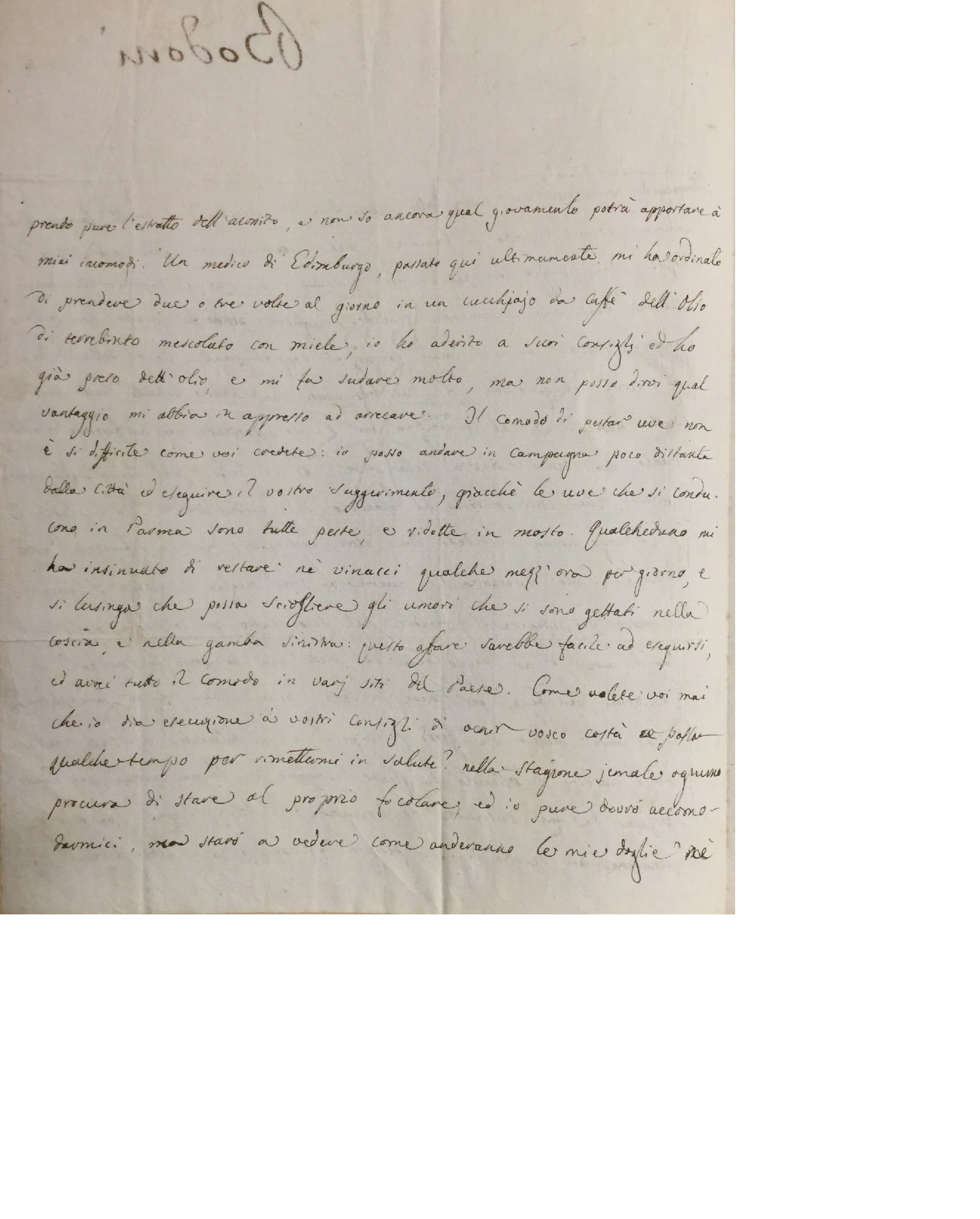 Come volete voi mai che io dia esecuzione a’ vostri consigli di venir vosco costà ae passar qualche tempo per rimettermi in salute? Nella stagione iemale ognuno procura di stare al proprio focolare, ed io pure dovrò accomodarmici, ma starò a vedere come anderanno le mie doglie ne’f tempi freddi e nevosi. Al più, sarebbe in primavera che m’indurrei a lasciare il placido soggiorno dela tranquilla Parma.
