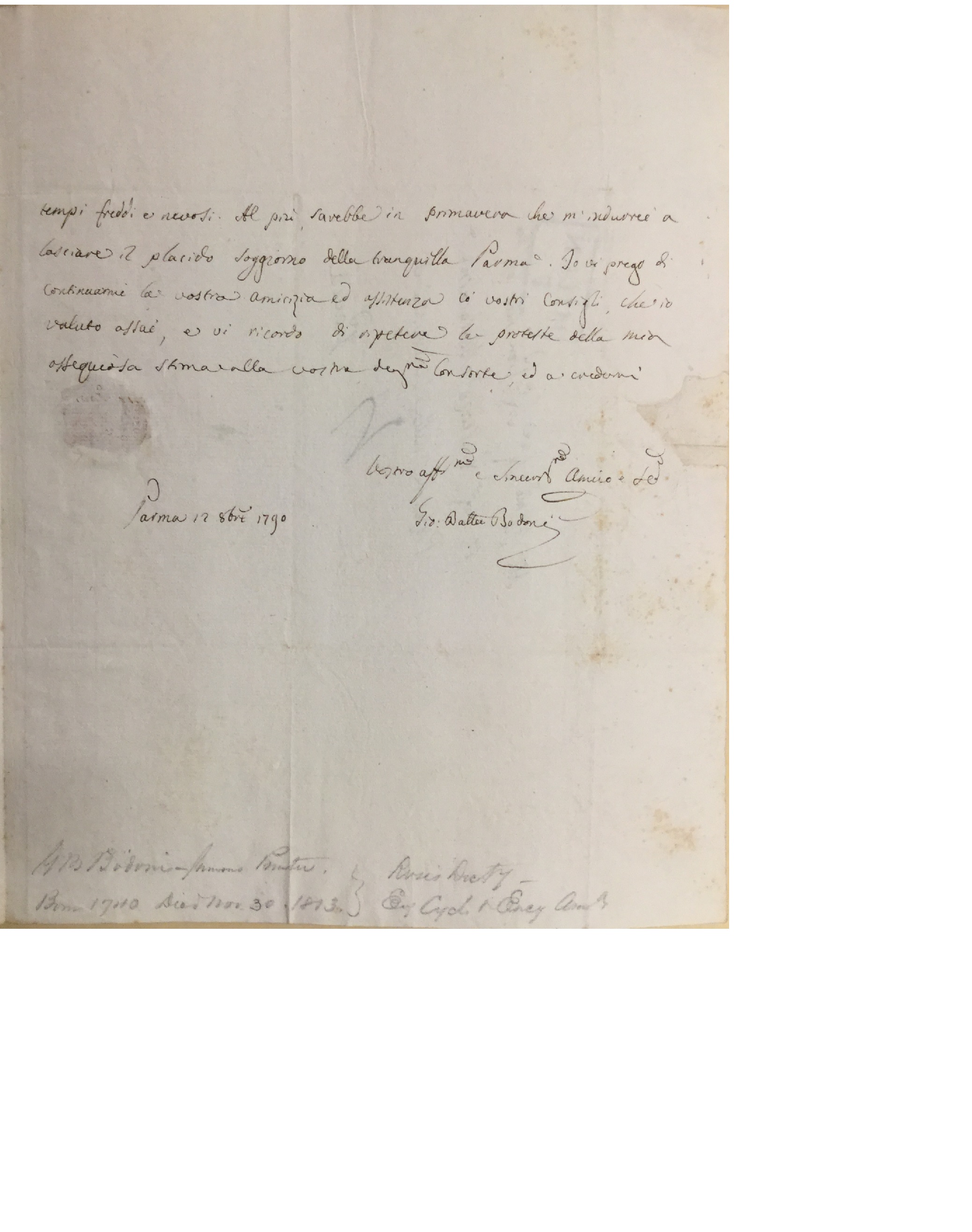 Bodoni makes a detailed account of his illness to his friend Doctor Vincenzo Malacarne.