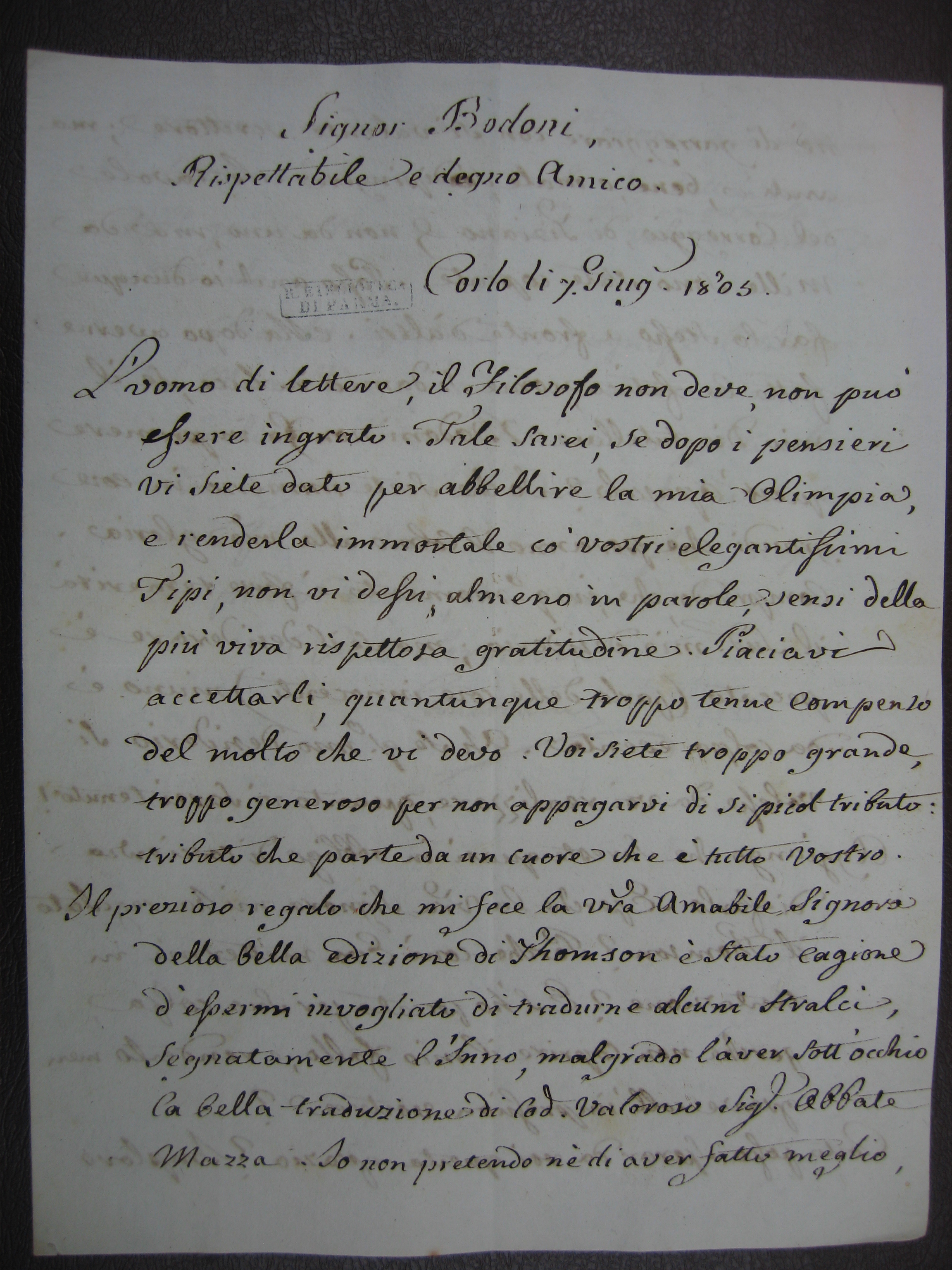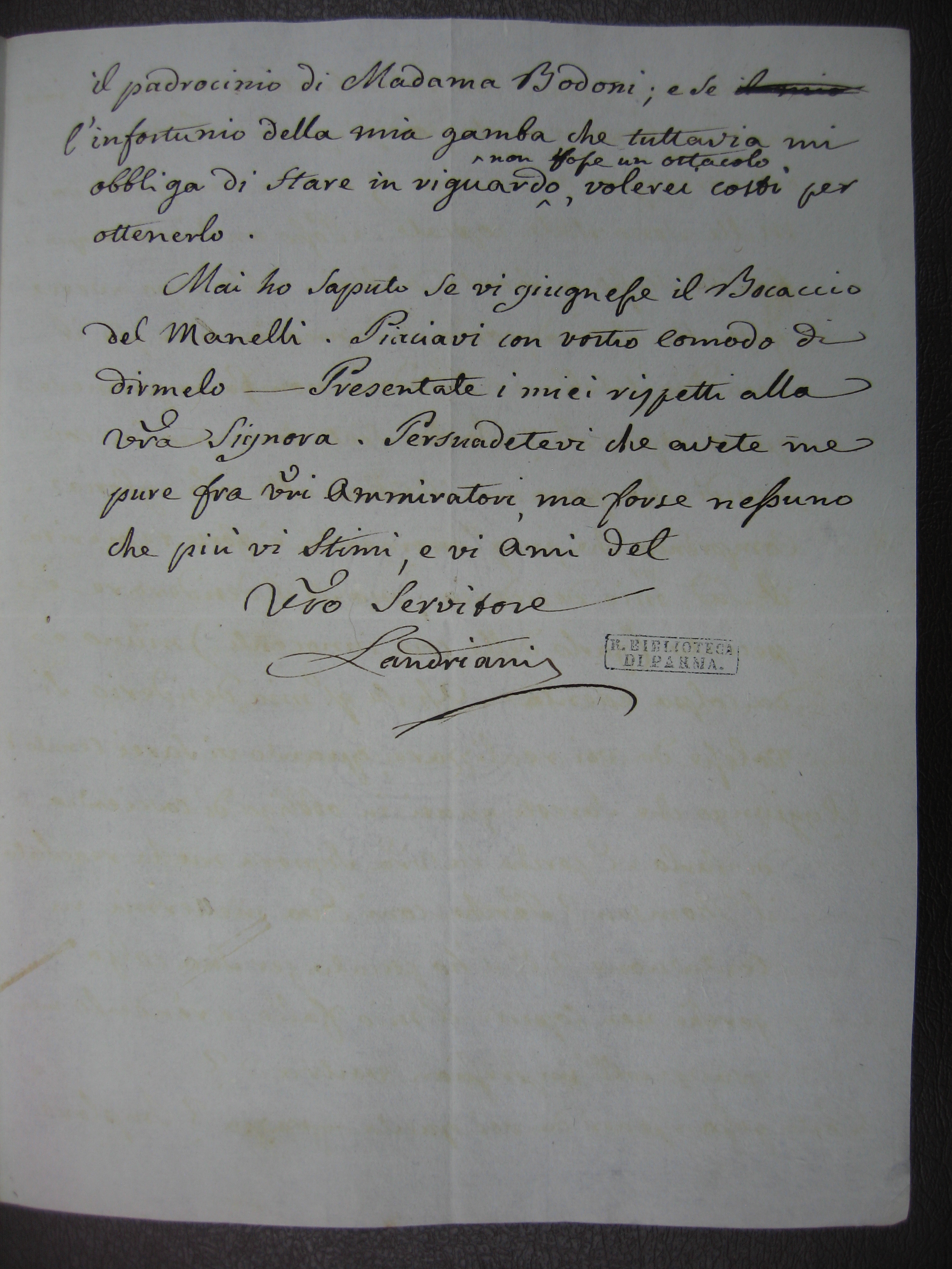From Luigi Landriani [Corlo] to Giambattista Bodoni [Parma].
