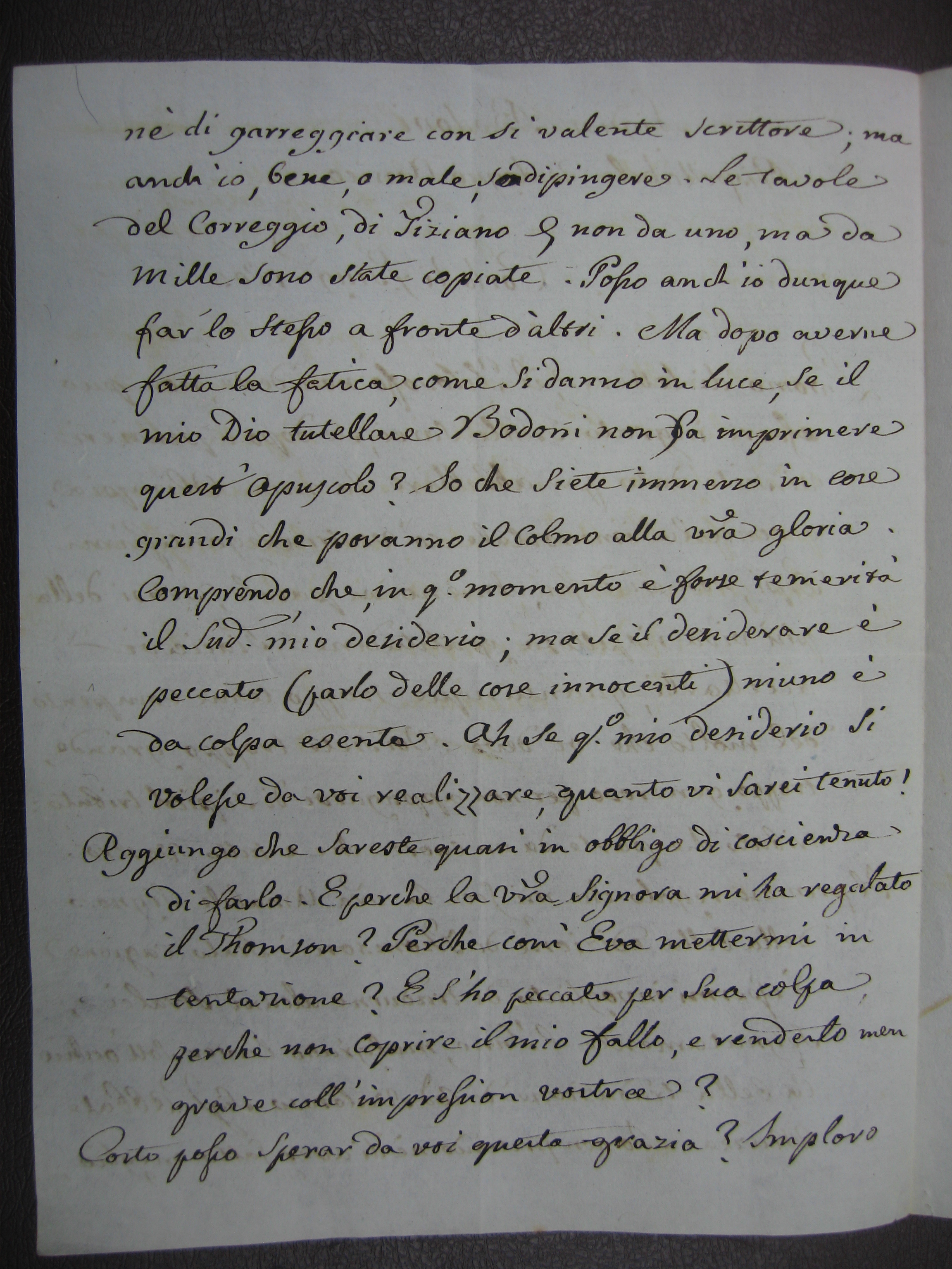 Il prezioso regalo che mi fece la vostra amabile Signora della bella edizione di Thomson è stato cagione d’essermi invogliato di tradurne alcuni stralci, segnatamente l’Inno, malgrado l’aver sott’occhio la bella traduzione di codesto valoroso Signore Abbate Mazza. Io non pretendo né di aver fatto meglio, né di garreggiare con sì valente scrittore, ma anch’io, bene o male, so dipingere. Le tavole del Correggio, di Tiziano, ecc., non da uno, ma da mille sono state copiate. Posso anch’io, dunque, far lo stesso a fronte d’altri. Ma dopo averne fatta la fatica, come si danno in luce se il mio dio tutellare Bodoni non fa imprimere quest’opuscolo? So che siete immerso in cose grandi che por[r]anno il colmo alla vostra gloria. Comprendo che in questo momento è forse temerità il suddetto mio desiderio. Ma se il desiderare è peccato –parlo delle cose innocenti– niuno è da colpa esento. Ah, se questo mio desierio si volesse da voi realizzare, quanto vi sarei tenuto!