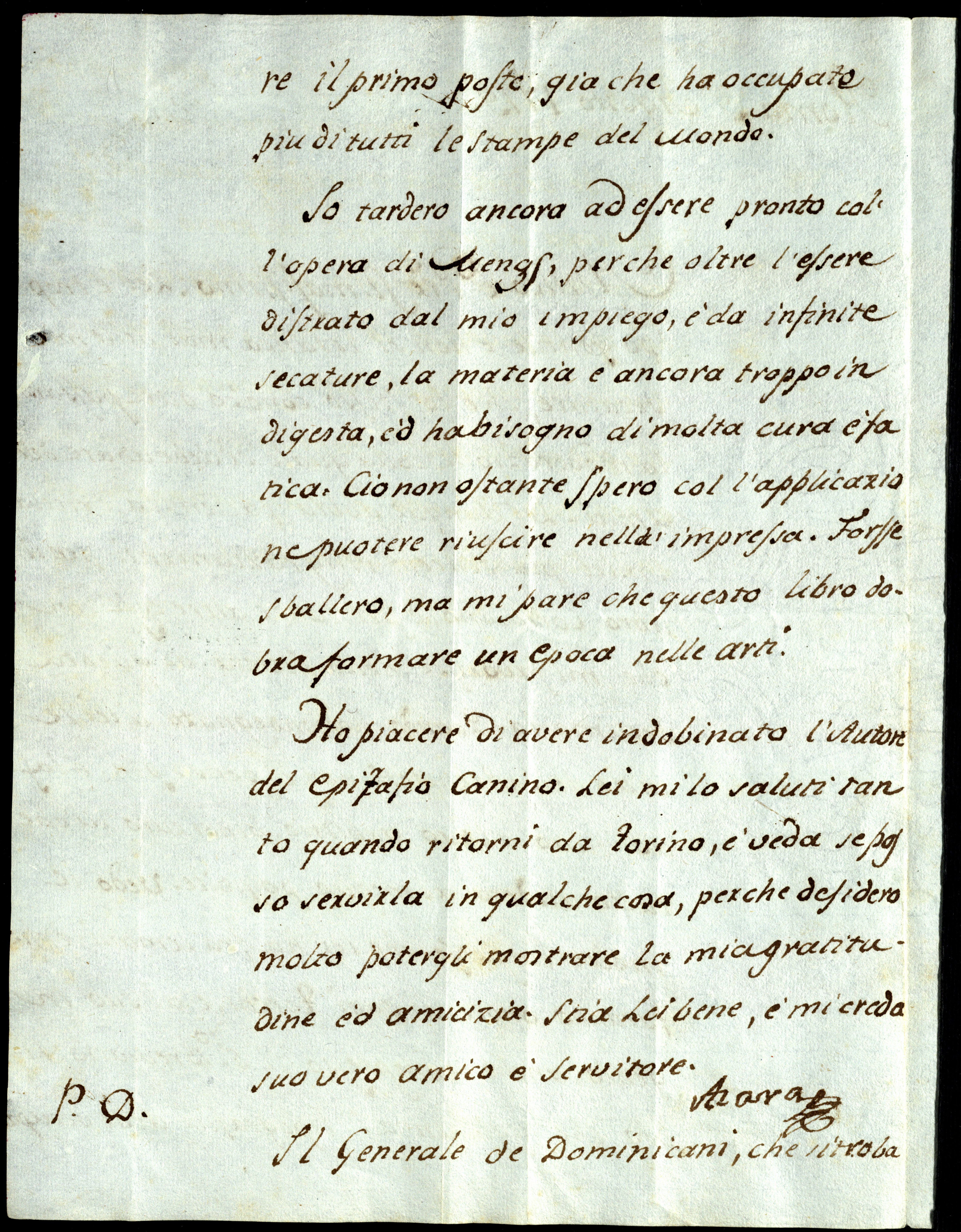 Io tarderò ancora ad essere pronto coll’opera di Mengs perché, oltre l’essere distrato dal mio impiego e da infinite secature, la materia è ancora troppo indigesta ed ha bisogno di molta cura e fatica. Ciò nonostante, spero coll’applicazione puotere riuscire nell’impressab. Forsse sballerò, ma mi pare che questo libro dobrà formare un’epoca nelle arti.