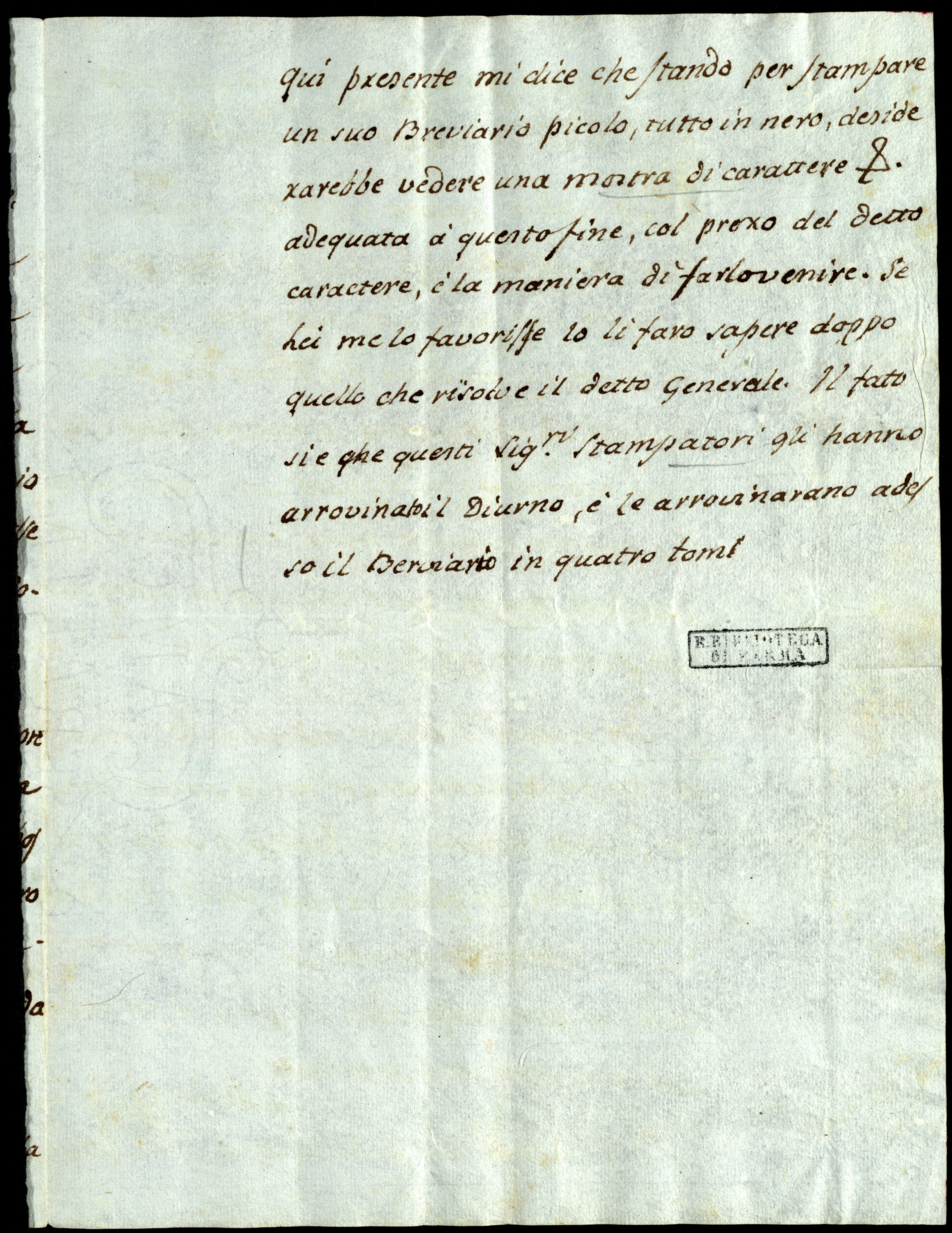 Il Generale de’ Dominicani, che si troba qui presente, mi dice che stando per stampare un suo breviario picolo, tutto in nero, desiderarebbe vedere una mostra di carattere, ecc. adequata a questo fine, col prexo del detto caractere e la maniera di farlo venire. Se Lei me lo favorisse, io li farò sapere doppo quello che risolve il detto Generale. Il fato si è chec questi signori stampatori gli hanno arrovinato il diurno e le arrovinarano adesso il berviario [sic] in quatro tomi.