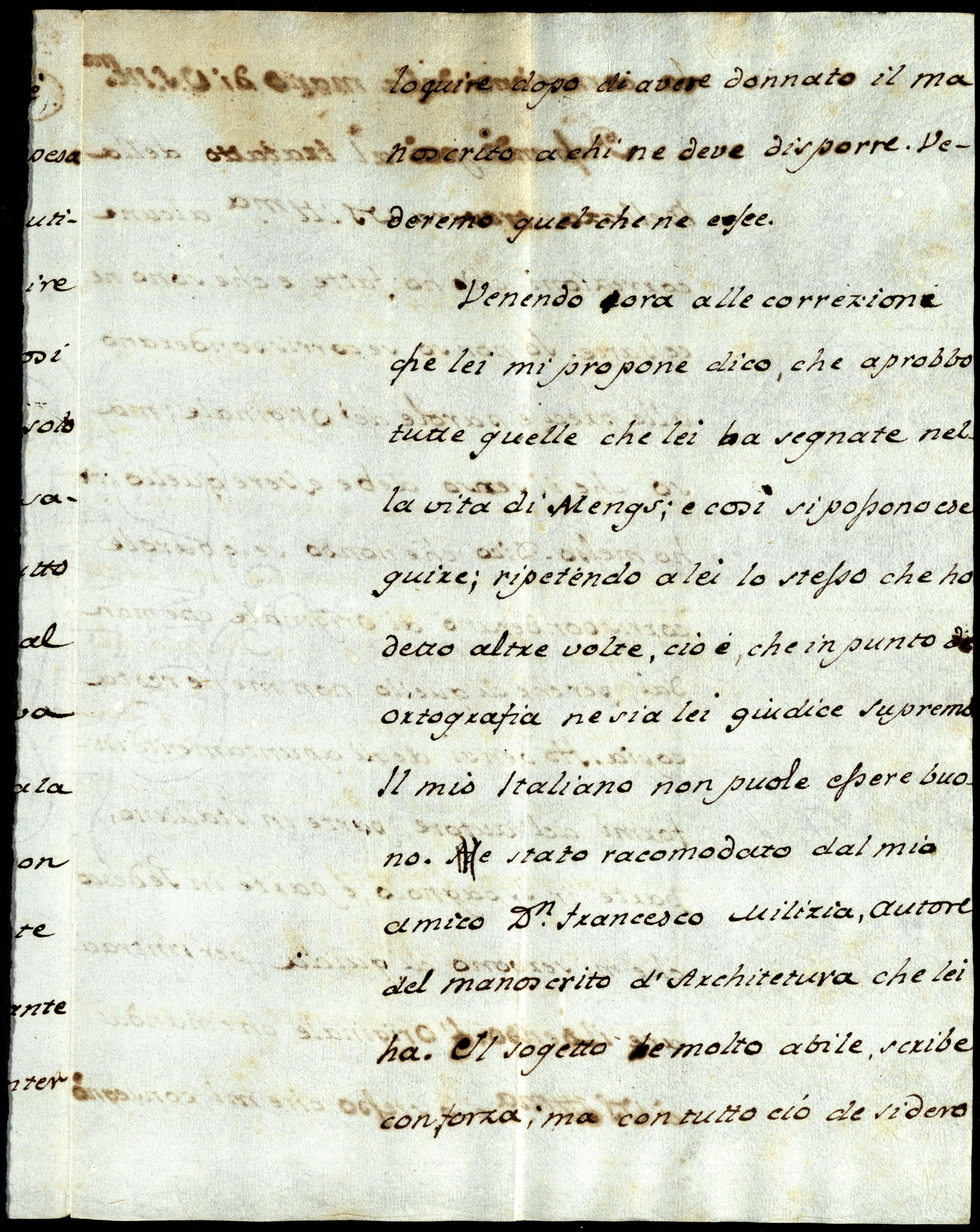 Venendo orah alle correzionii che Lei mi propone, dico che aprobbo tutte quelle che Lei hak segnate nella vita di Mengs e così si possono eseguire, ripetendo a Lei lo stesso che ho detto altre volte; cioè, che in punto di ortografia ne sia Lei giudice supremo. Il mio italiano non puole essere buono. Èl stato racomodato dal mio amico Don Francesco Milizia, autore del manoscrito d’architetura che Lei ha, e il sogetto èm molto abile, scribe con forza; ma, con tutto ciò, desidero la correzione dalla mano di Vostra Signoria Illustrissima.