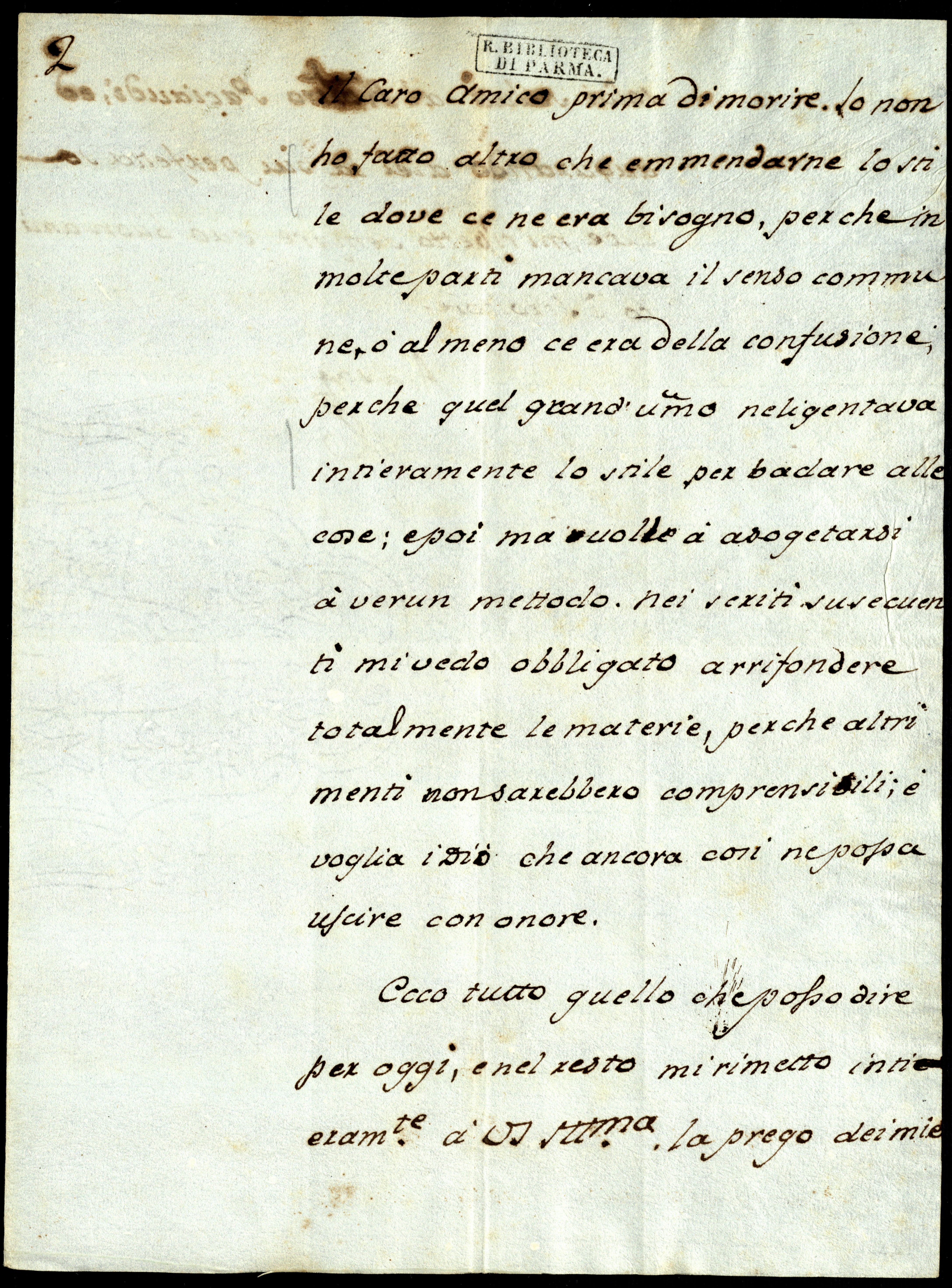 Passando poi al tratatto della bellezza, troverà Vostra Signoria Illustrissima alcune correzioni ch’hon fatte e che sono necessarie. Io non so se corrisponderano alle precise parole del originale, ma so che il senso debe essere quello ch’hoo messo. Dico che non so se le parole corrisponderano al’originale che mandai perché di quello non me ne resta copia. Ho, bensì, degli apuntamenti informi del’autore, parte in italiano, parte in sspagnolo e parte in tedesco, che mi servono di guida per rintraciare il senso. L’originale che mandai a Vostra Signoria Illustrissima è lo stesso che mi consegnó il caro amico prima di morire. Io non ho fatto altro che emmendarne lo stile dove ce ne era bisogno, perché in molte parti mancava il senso commune o almeno ce era della confusione, perché quel grand’ummo neligentava intieramente lo stile per badare alle cose e, poi, ma[i] uollep a asogetarsi a verun mettodo. Nei scriti susecuenti mi vedo obbligato a rrifondere totalmente le materie perché, altrimenti, non sarebbero comprensibili, e voglia i Dioq che ancora così ne possa uscire con onore.