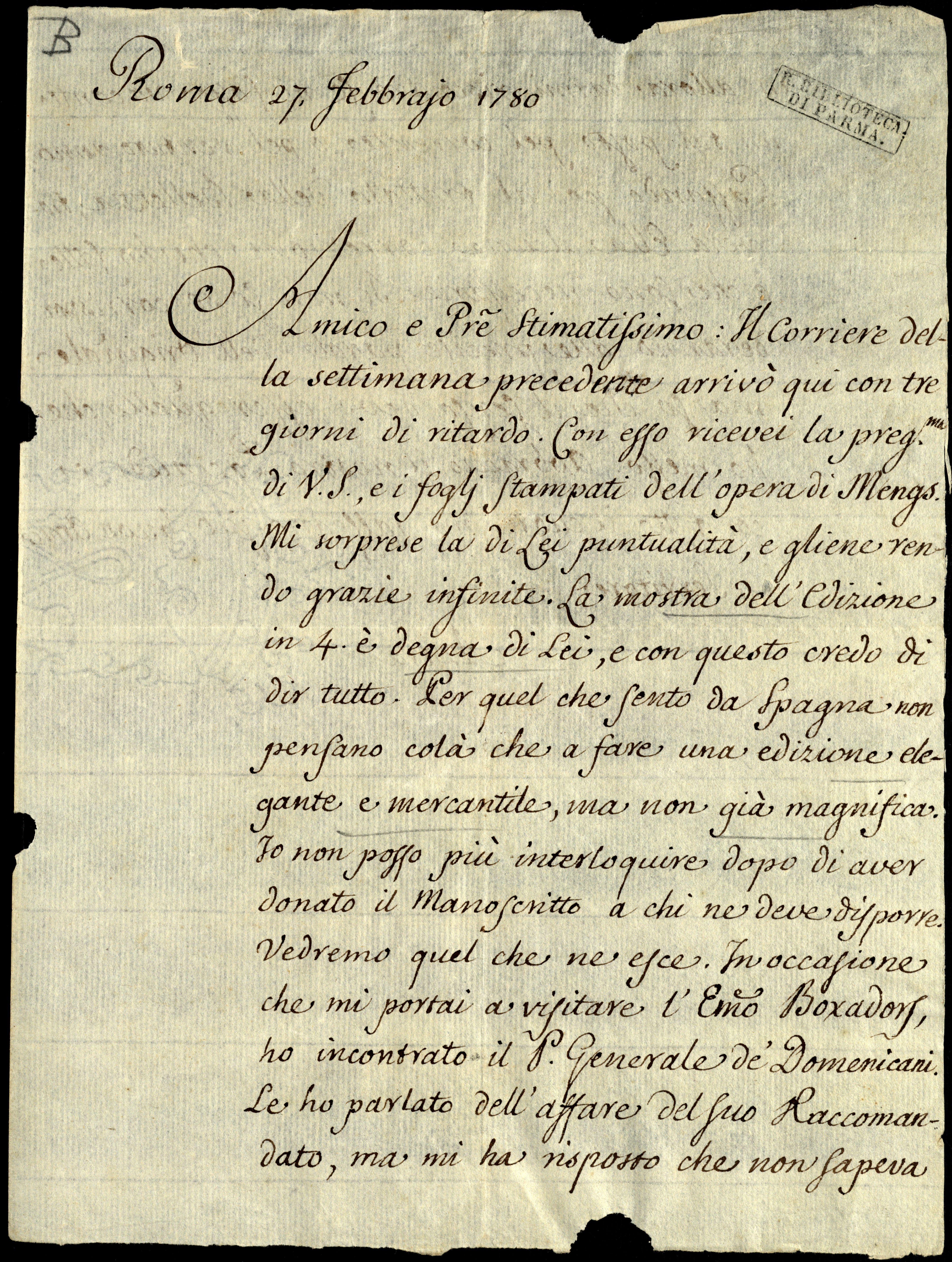 Il corriere della settimana precedente arrivò qui con tre giorni di ritardo. Con esso ricevei la pregiatissima di Vostra Signoria e i fogli stampati dell’opera di Mengs. Mi sorprese la di Lei puntualità e gliene rendo grazie infinite. La mostra dell’edizione in-4º è degna di Lei, e con questo credo di dir tutto.