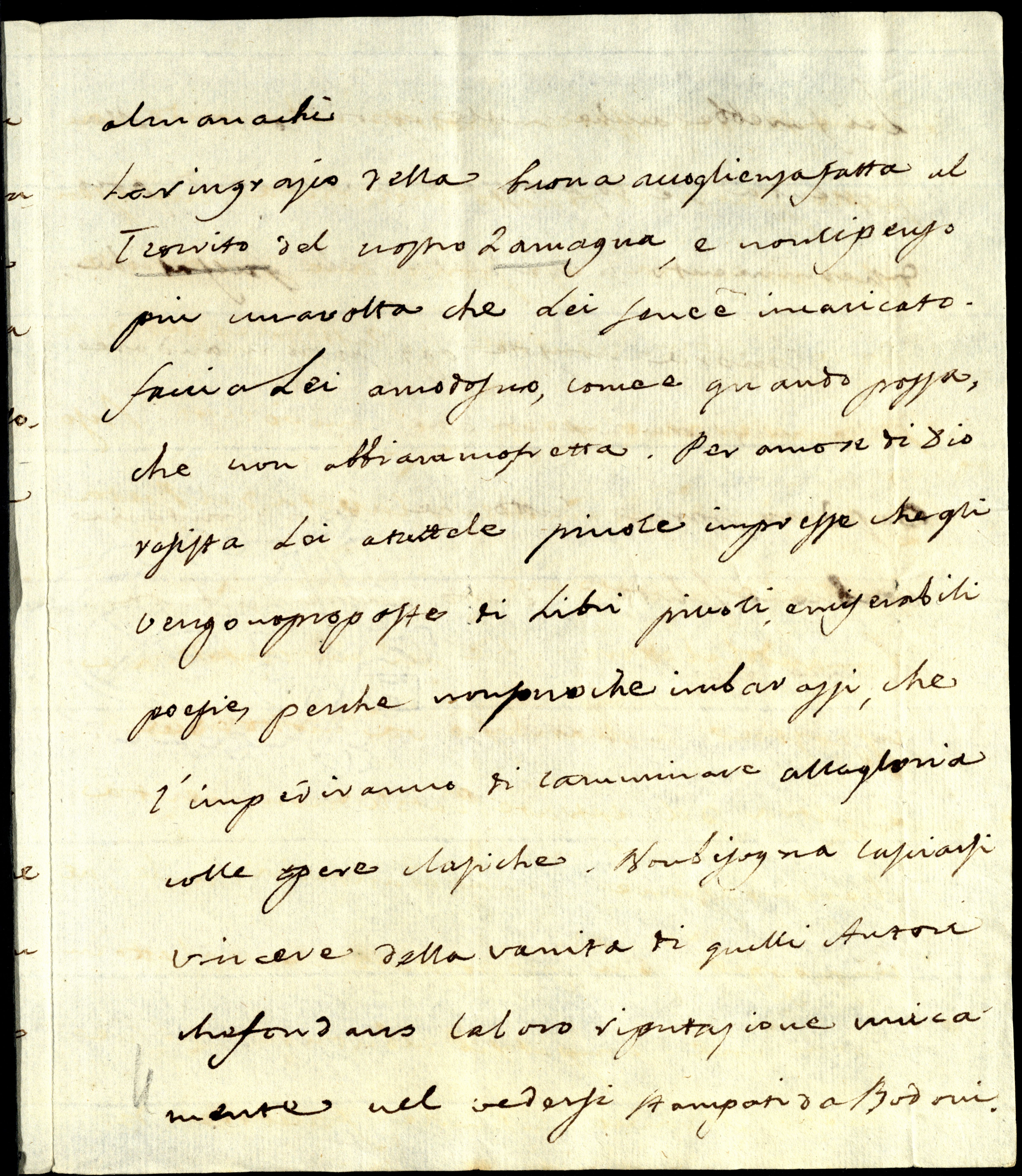 Per amore di Dio, rasista Lei a tutte le piccole impresse che gli vengono proposte di libri piccoli e miserabili poesie, perché non sono che imbarassi che L’impediranno di camminare alla gloria colle opere clasiche. Non bisogna lasciarsi vincere della vanità di quelli autori che fondano la loro riputazione unicamente nel vedersi stampati da Bodoni. Lei farebbe anche male i Suoi conti colla posterità se lo potessero accussare di poco discernimento nella scelta delle Sue fatiche.