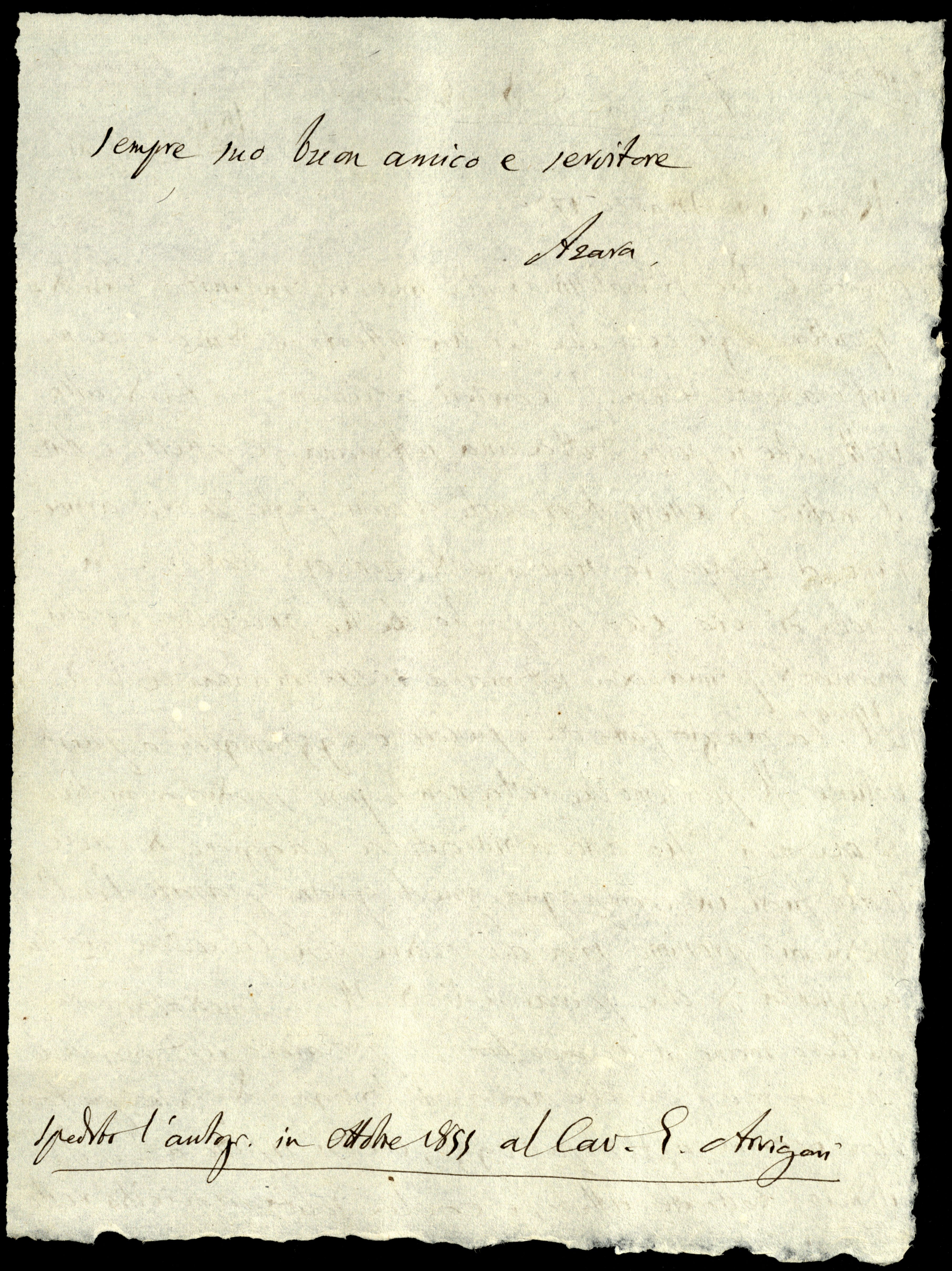 a En el margen superior de la página, una mano diferente anota –respectivamente, en el lateral izquierdo y derecho– Epistolario y Cambio, mientras que en el centro escribe Azara a G. B. Bodoni b Firma de la mano del copista; no autógrafa. Al final de la página, además, se anota, de otra mano posterior: spedito l’autografo in ottobre 1855 al Cavaliere Signor Arrigori