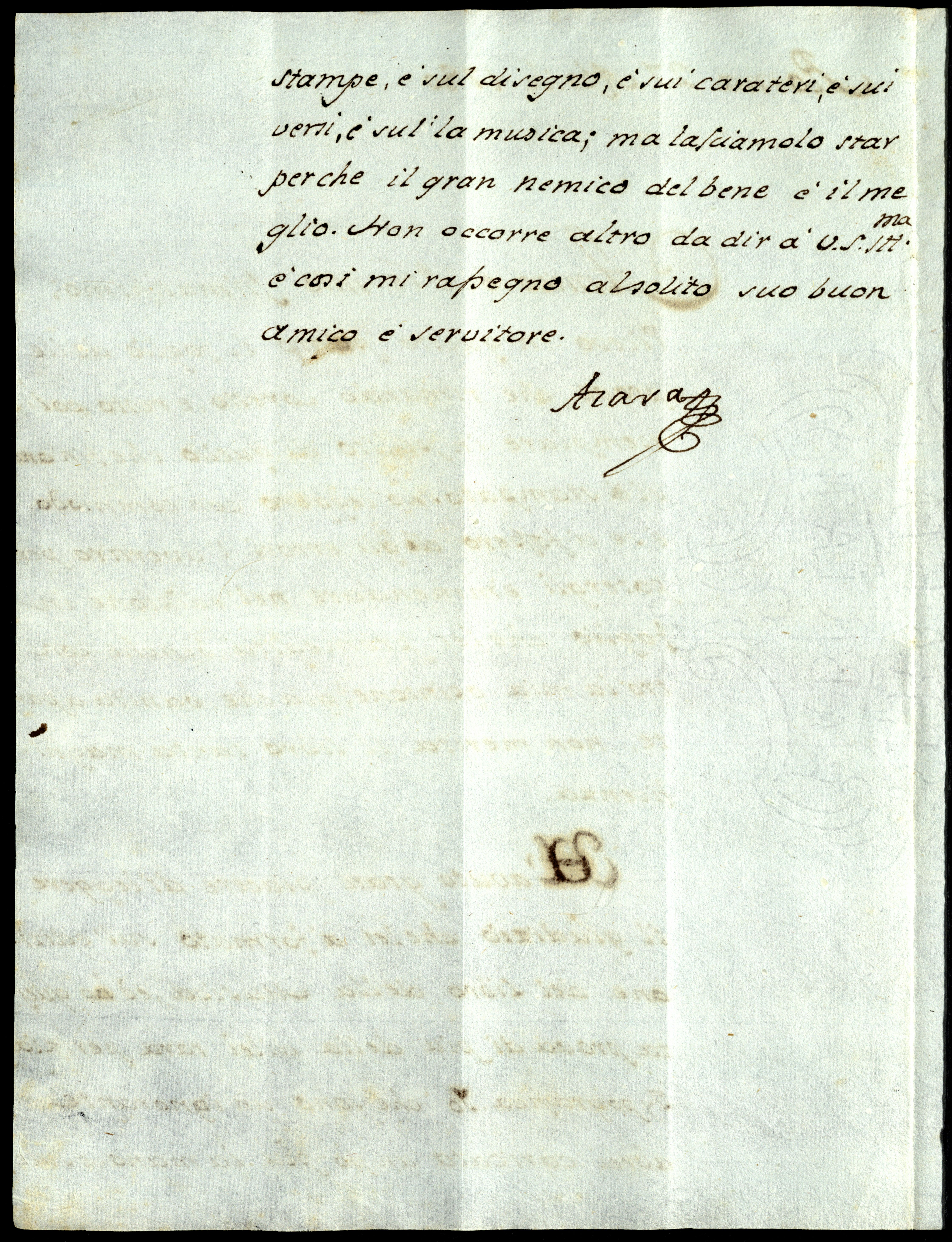 H’avutoc gran piacere di leggere il giudizio che Lei ha formato sul’edizione del Libro della musica ed hod questa prova di più della di Lei rara perizia typografica. Io, che sono un ignorantee, abrei caricata un po’ più la mano e sul estampe, e sul disegno, e sui carateri, e sui versi, e sulla musica; ma lasciamolo star perché il gran nemico del bene è il meglio.