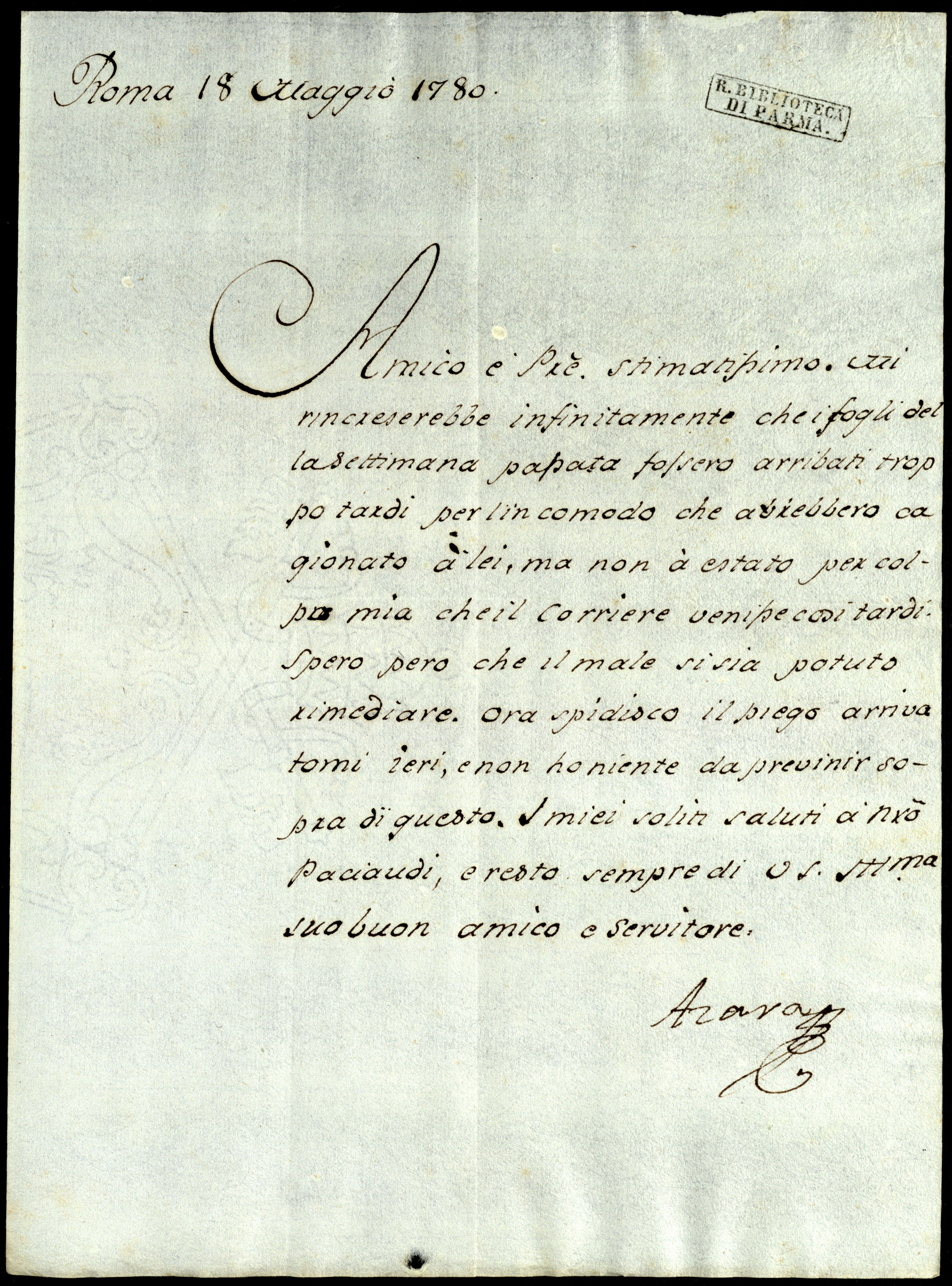 De José Nicolás de Azara [Roma] a Giambattista Bodoni [Parma].