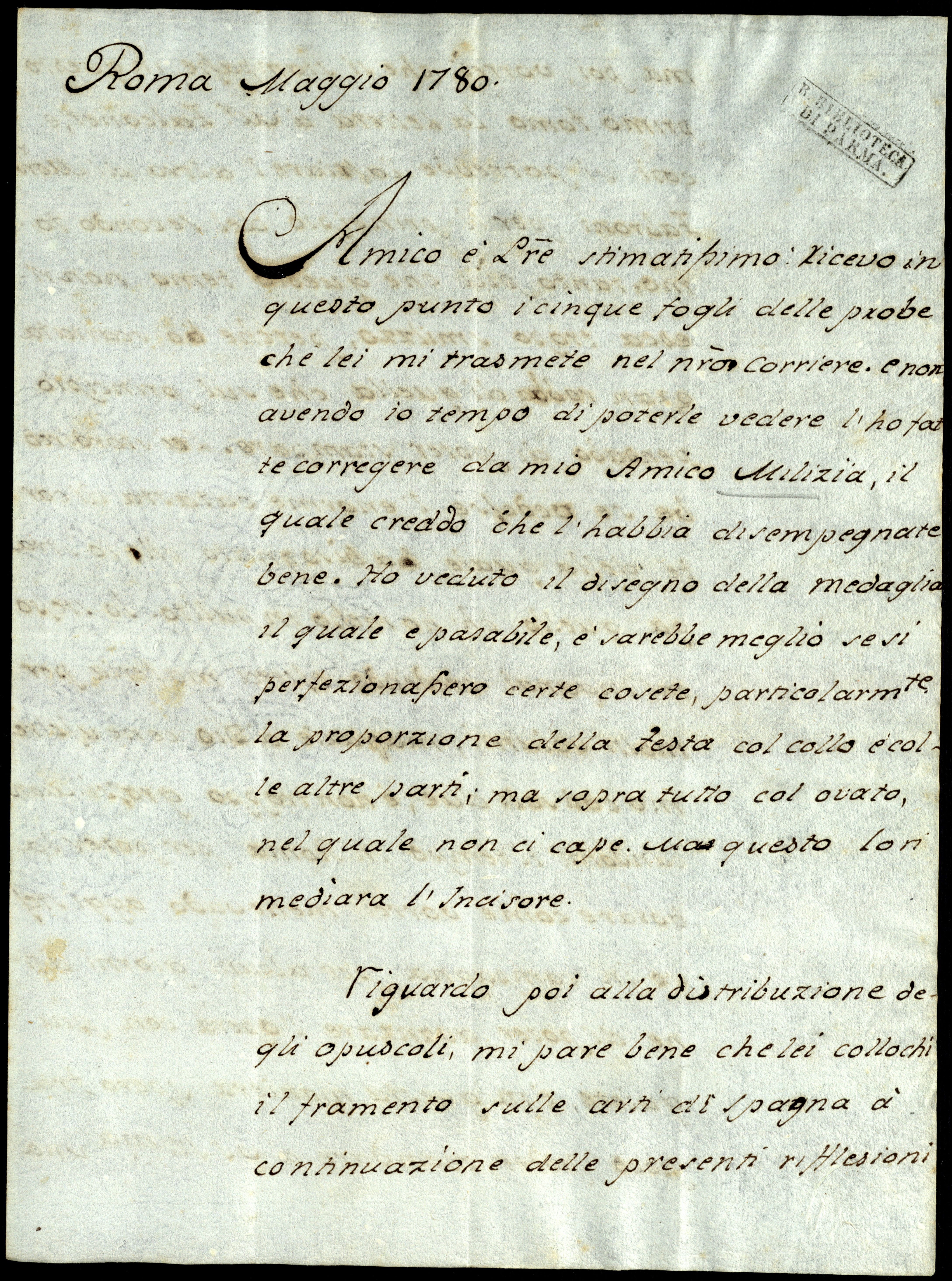 Ricevo in questo punto i cinque fogli delle probe che Lei mi trasmete nel nostro corriere e, non avendo io tempo di poterle vedere, l’ho fatte corregere da mio amico Milizia, il quale creddo che l’habbia disempegnate bene.