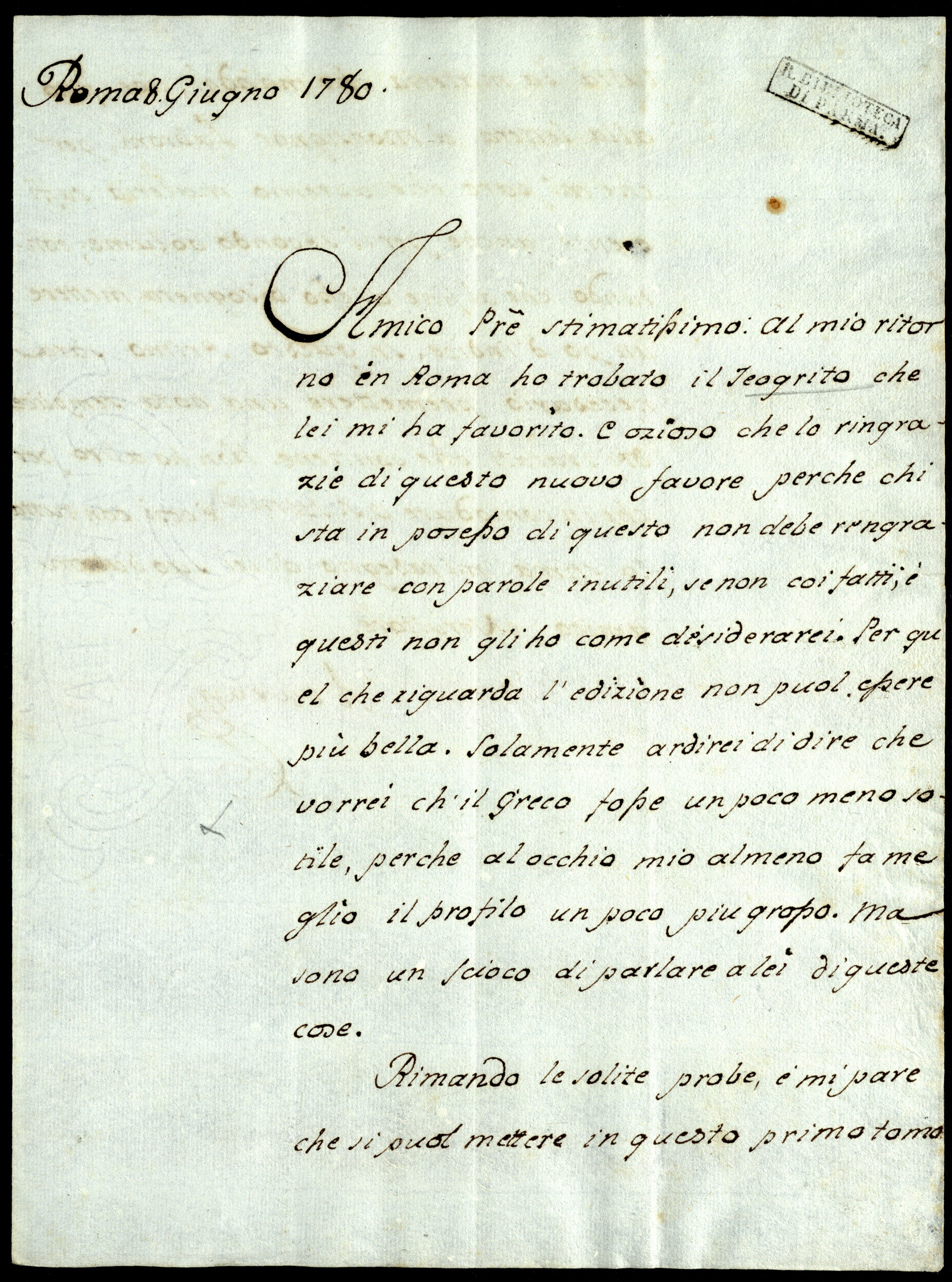 Al mio ritorno ina Roma ho trobato il Teogrito che Lei mi ha favorito. È ozioso che Lo [sic] ringrazie di questo nuovo favore perché chi sta in posesso di questo non debe rengraziare con parole inutili, se non coi fatti, e questi non gli ho come desiderareib.