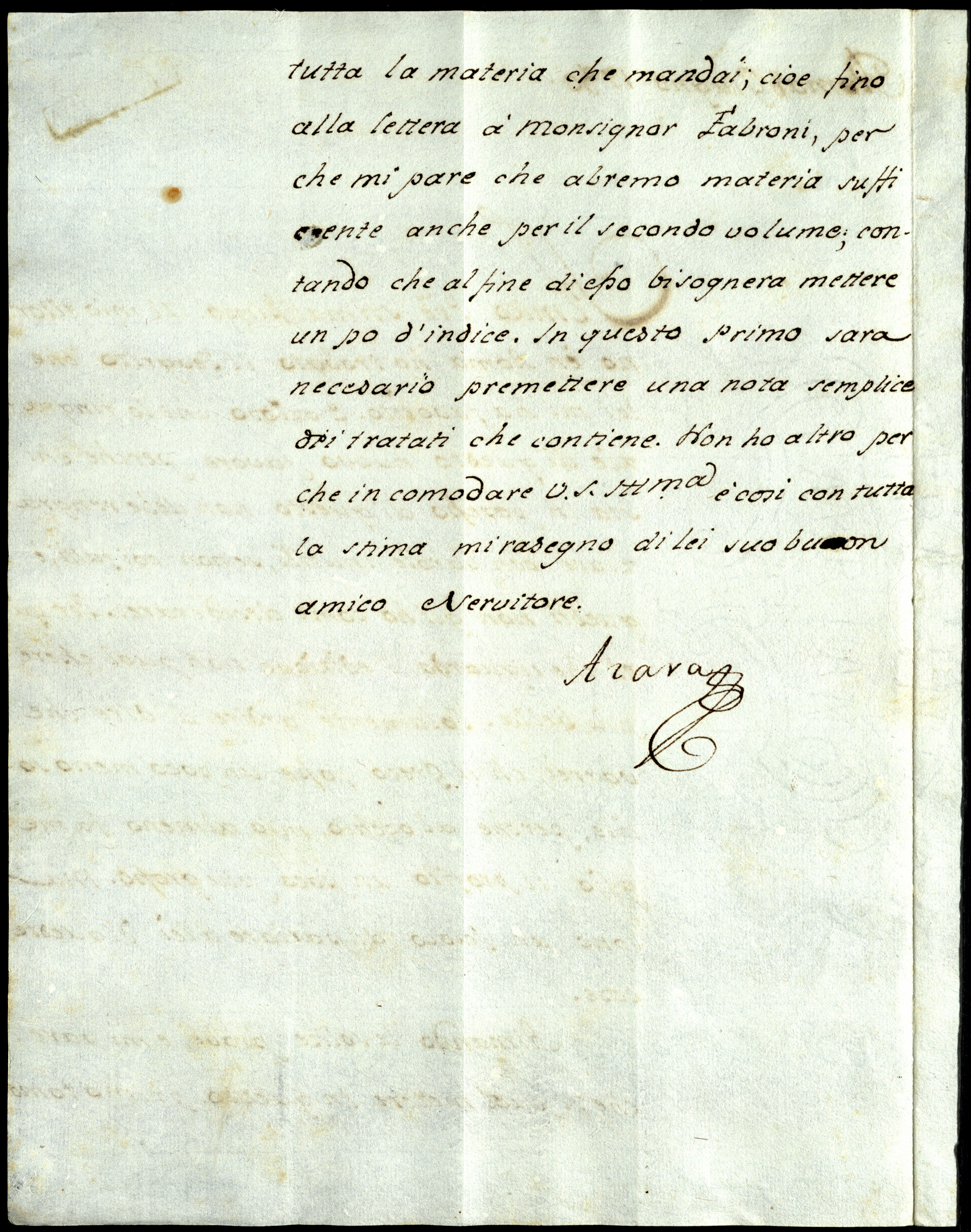 Rimando le solite probe e mi pare che si puol mettere in questo primo tomo tutta la materia che mandai, cioè fino alla lettera a Monsignor Fabroni, perché mi pare che abremo materia sufficentec anche per il secondo volume, contando che al fine di esso bisognerà mettere un po’ d’indice. In questo primo sarà necesario premettere una nota semplice deid tratati che contiene.