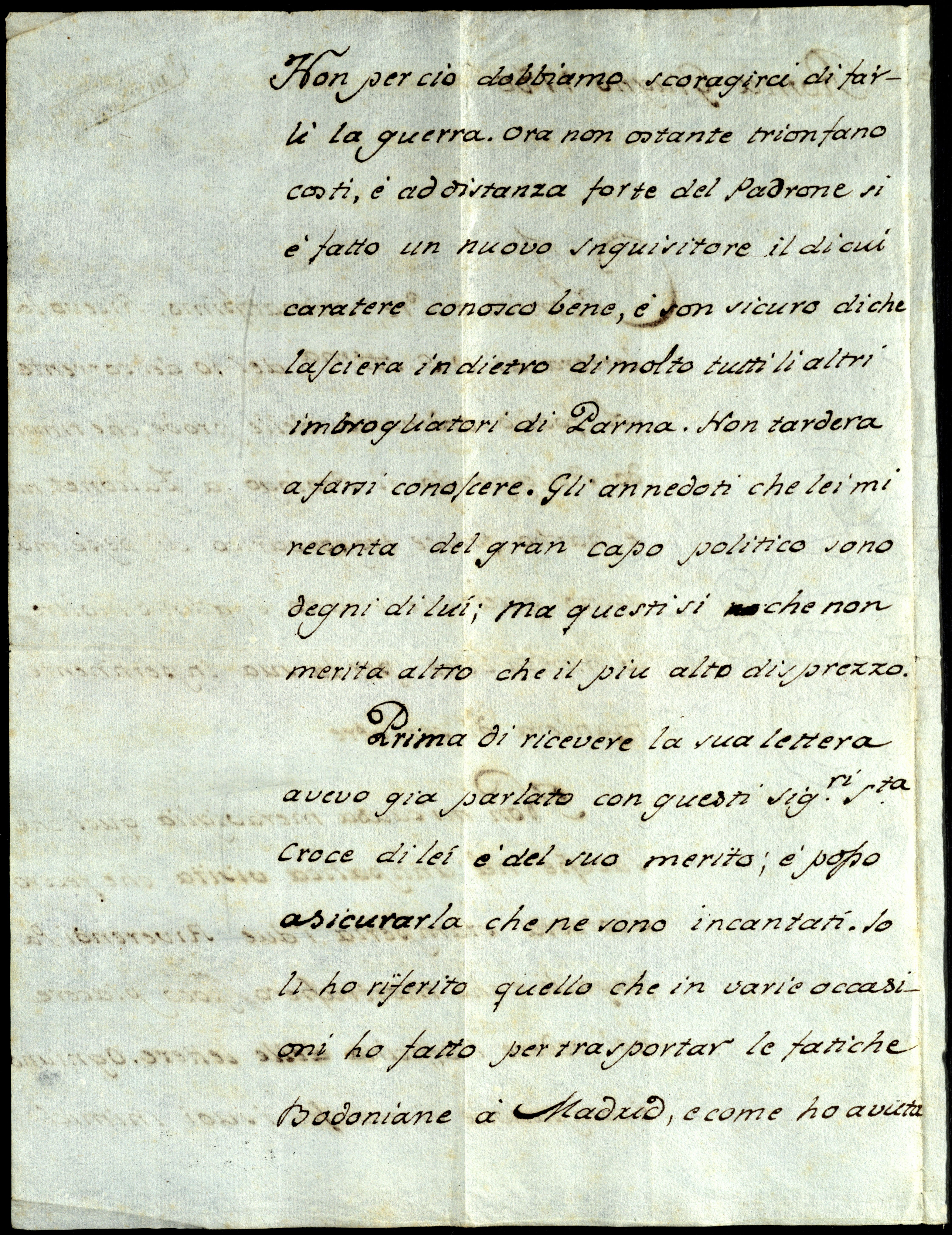 Non mi causa meraviglia quel che sucesse nel’antipatica visita che fecero a cotesta Stamperia i due riverendi papagalli e che mostrassero poco piacere nel vedere l’officina delle lettere. Ogniuno è compatibile si aboriscea i suoi inimici; non perciò dobbiamo scoragirci di farli la guerra. Ora nonostante trionfano costì e ad distanzab forte del padrone si è fatto un nuovo inquisitore, il di cui caratere conosco bene e son sicuro di che lascierà indietro di molto tutti li altri imbrogliatori di Parma. Non tarderà a farsi conoscere.