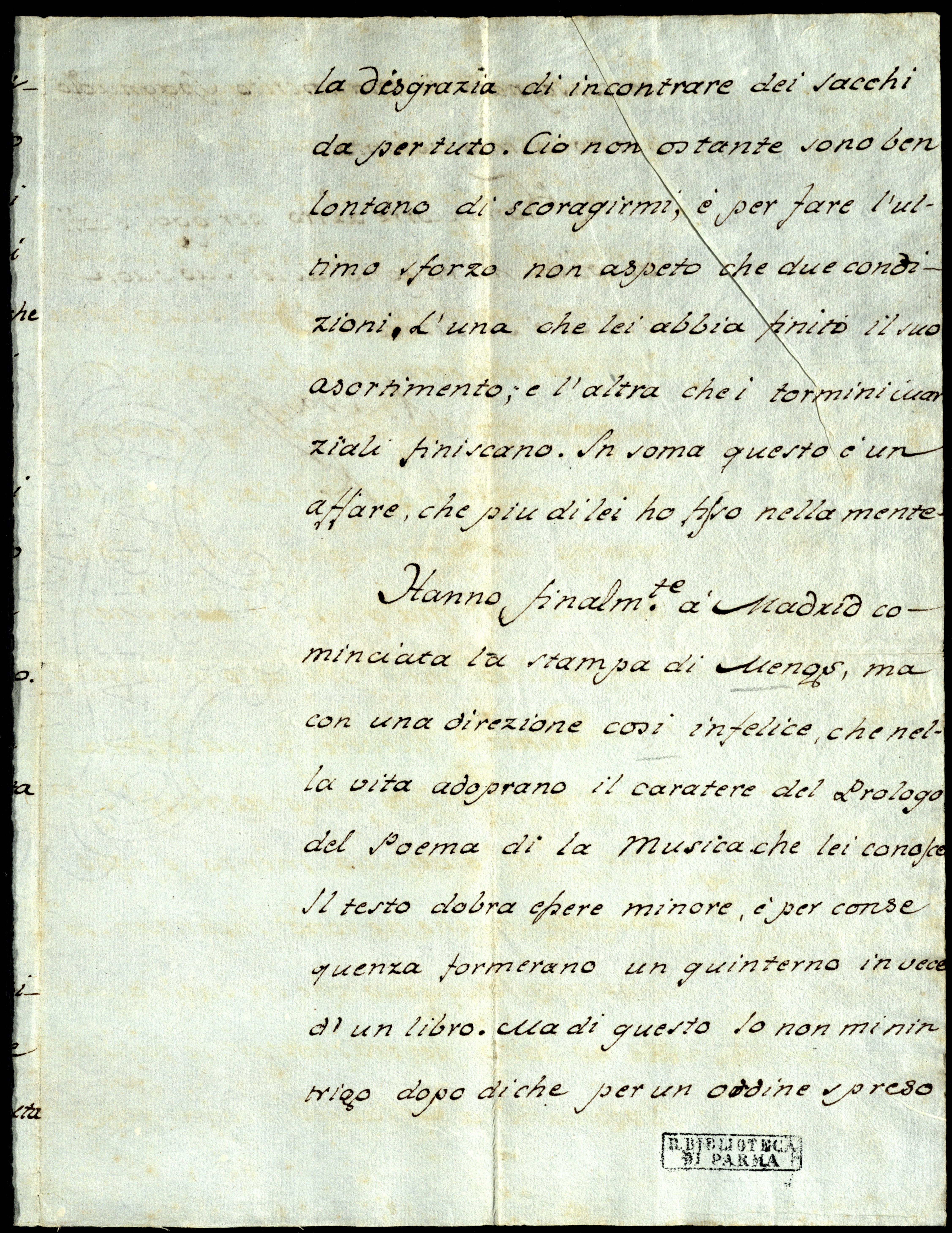Hanno finalmente a Madrid cominciata la stampa di Mengs, ma con una direzione così infelice che nella vita adoprano il caratere del prologo del poema di La musica che Lei conosce. Il testo dobrà essere minore e, per consequenza, formerano un quinterno in vece d’un libro. Ma di questo io non mi n’intrigo dopo di che per un ordinef spreso ho consegnato il manoscrito spagnuolo contro la mia volontà.