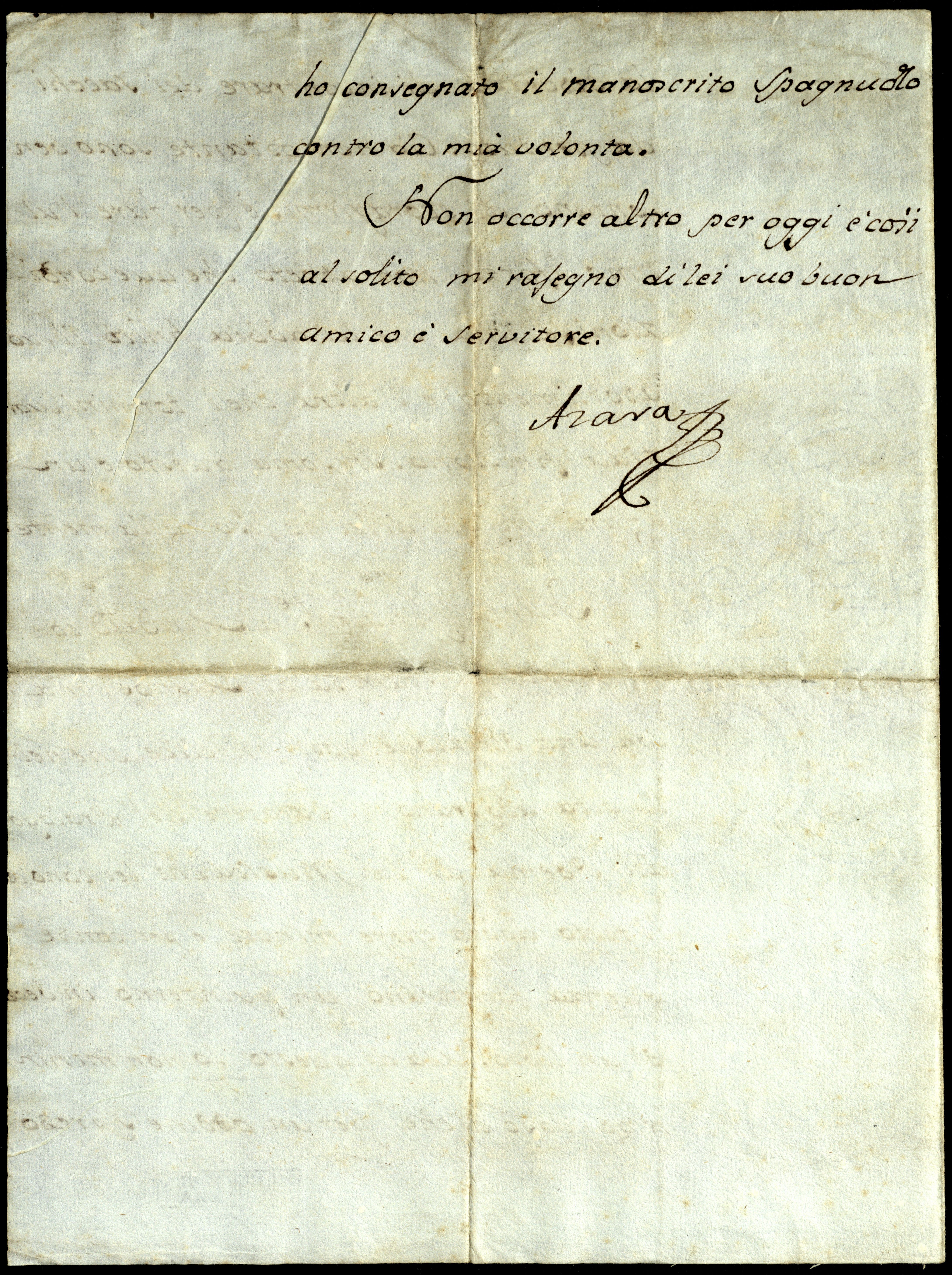 Non occorre altro per oggi. E così, al solito mi rasegno di Lei Suo buon amico e servitore,