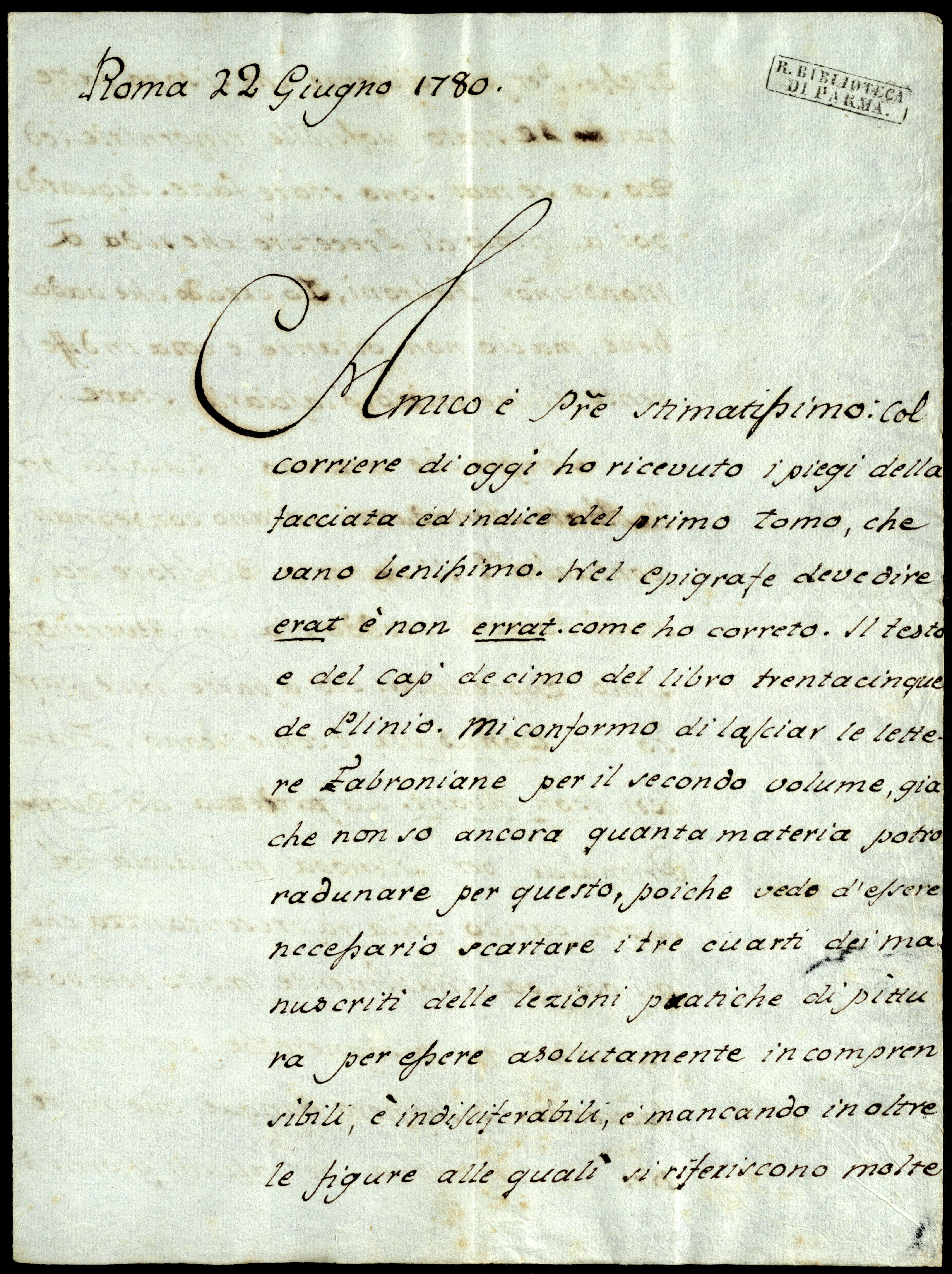 Col corriere di oggi ho ricevuto i piegi della facciata ed indice del primo tomo, che vano benissimo. Nel epigrafe deve dire erat e non errat, come ho correto. Il testo è del capitolo decimo del libro trentacinque de Plinio. Mi conformo di lasciar le lettere fabroniane per il secondo volume, giaché non so ancora quanta materia potrò radunare per questo, poiché vedo d’essere necessario scartare i tre cuarti dei manuscriti delle lezioni pratichea di pittura per essere asolutamente incomprensibili e indisciferabili, e mancando, inoltre, le figure alle quali si riferiscono molte di esse. Per più diligenze che si sono fatte, non èb stato possibile rinvenirle, ed Dio sa se mai sono state fatte. Riguardo poi al titolo di Precetore che si da a Monsignor Fabroni, io creddo che vada bene, ma, ciò nonostante, è cosa indifferente il metercieloc o lasciarlo stare.
