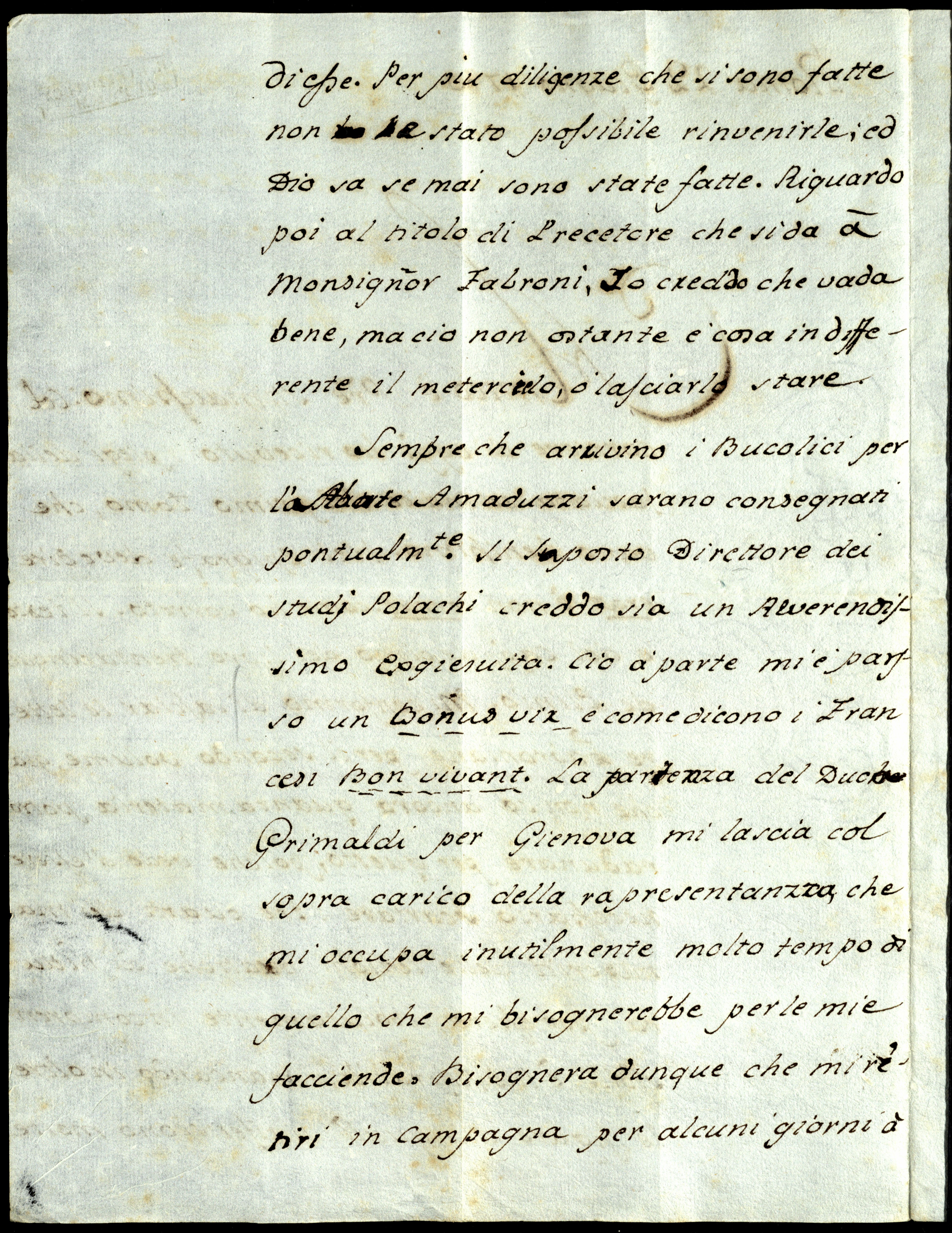 Azara acusa recibo de la portada e índice del primer tomo de las Opere de Mengs, indica una corrección que afecta a un epígrafe y decide dejar la carta de Fabroni para completar el segundo volumen. Asegura que entregará las Poesie buccoliche a Amaduzzi cuando las reciba, opina con benevolencia sobre el nuevo director de estudios polacos, exjesuita, y anuncia que necesitará retirarse al campo para preparar el manuscrito del segundo tomo de las Opere de Mengs, ya que la ausencia de Grimaldi incrementa su trabajo.
