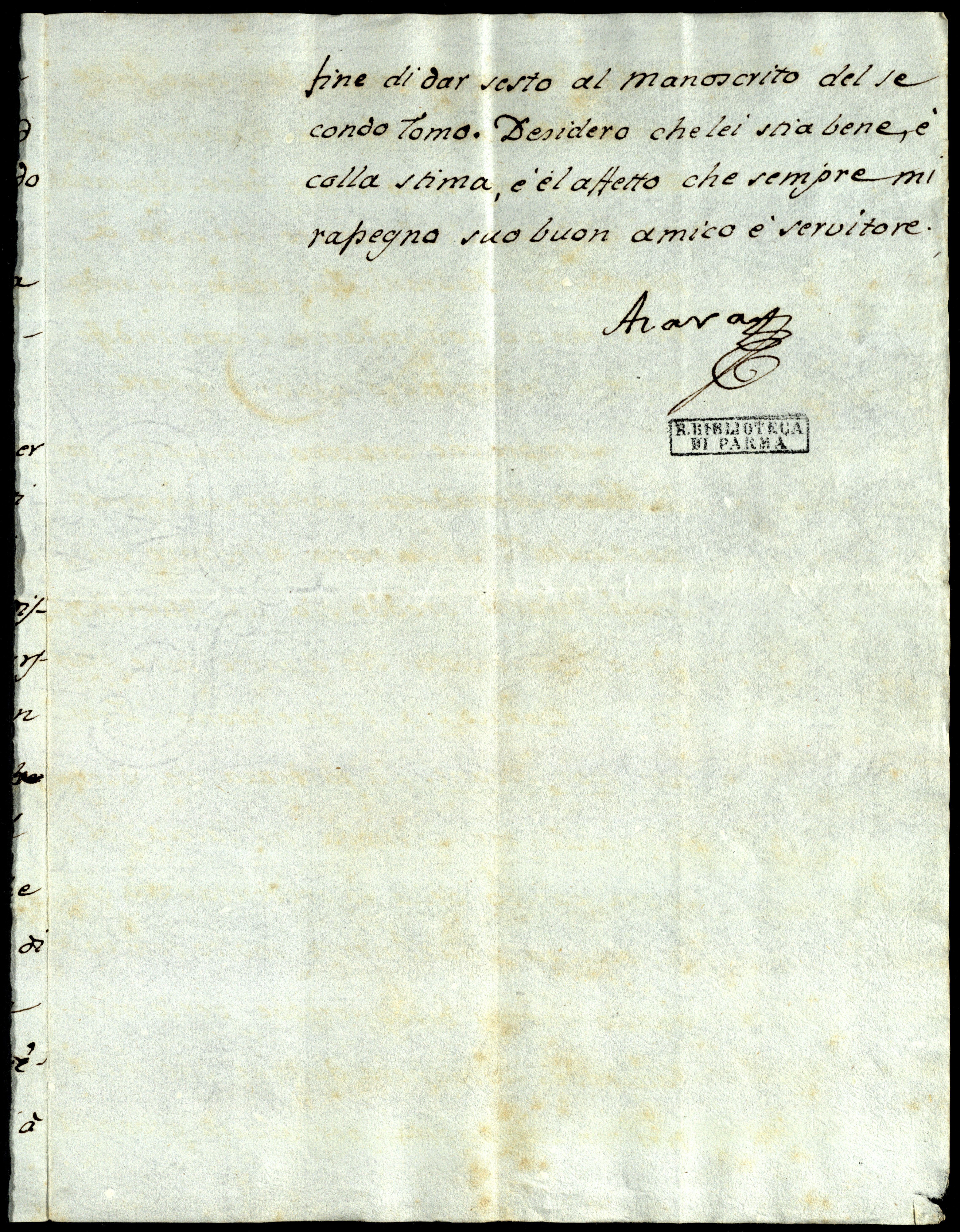 La partenzaf del Ducag Grimaldi per Gienova mi lascia col sopracarico della rapresentanzzah, che mi occupa inutilmente molto tempo di quello che mi bisognerebbe per le mie facciende. Bisognerà dunque che mi ritirii in campagna per alcuni giorni a fine di dar sesto al manoscrito del secondo tomo.