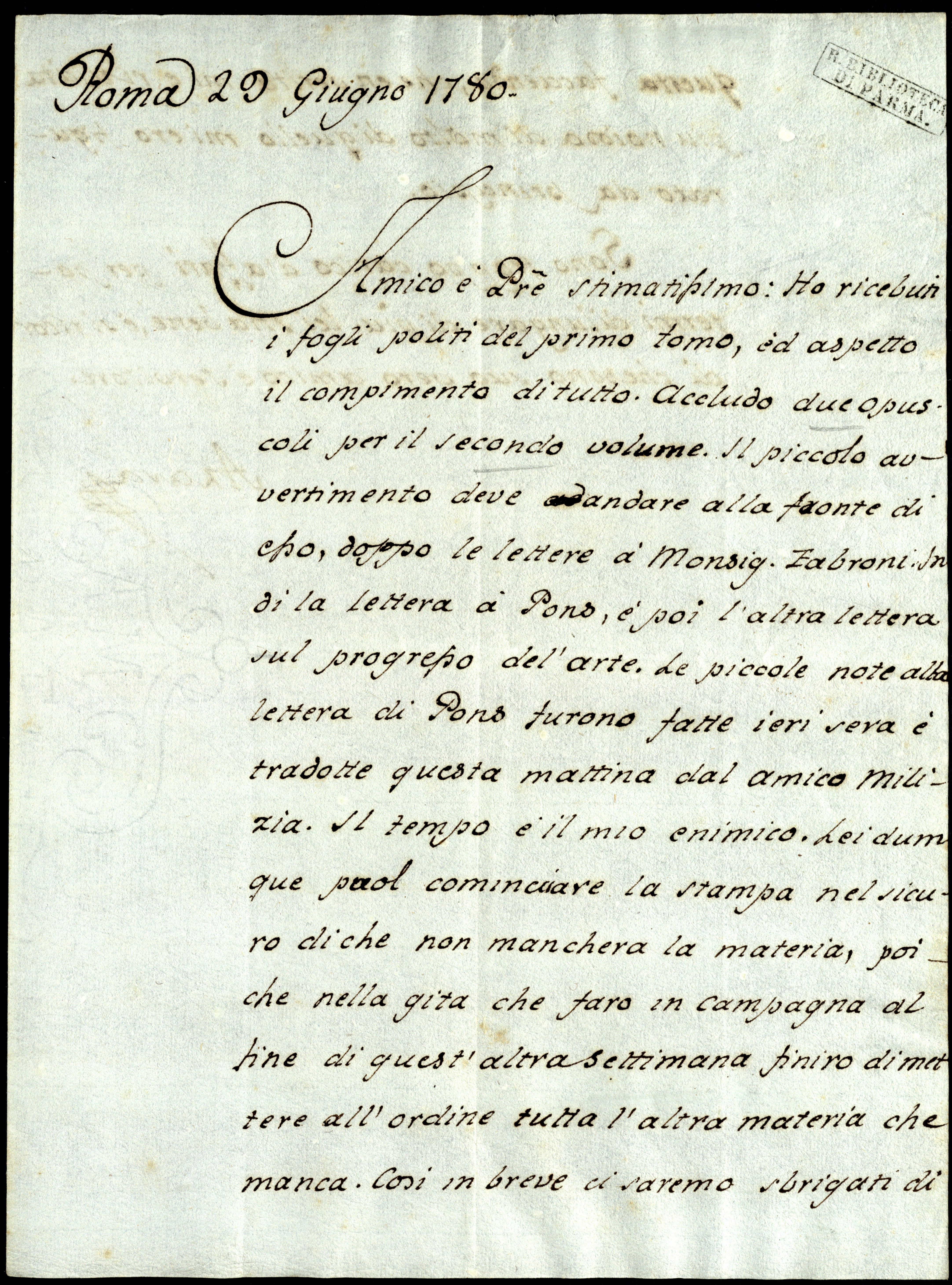 Ho ricebuti i fogli politi del primo tomo ed aspetto il compimento di tutto. Accludo due opuscoli per il secondo volume. Il piccolo avvertimento deve andarea alla fronteb di esso, doppo le lettere a Monsignore Fabroni, indi la lettera a Pons e poi l’altra lettera sul progresso del’Arte. Le piccole note alla lettera di Pons furono fatte ieri sera e tradotte questa mattina dal amico Milizia. Il tempo è il mio enimico. Lei dumque puolc comincciared la stampa nel sicuro di che non mancherà la materia, poiché nella gita che farò in campagna al fine di quest’altra settimana finirò di mettere all’ordine tutta l’altra materia che manca. Così, in breve ci saremo sbrigati di questa faccienda che, en verità, mi è riuscita più noiosa di molto di quello mi ero figurato da principio.