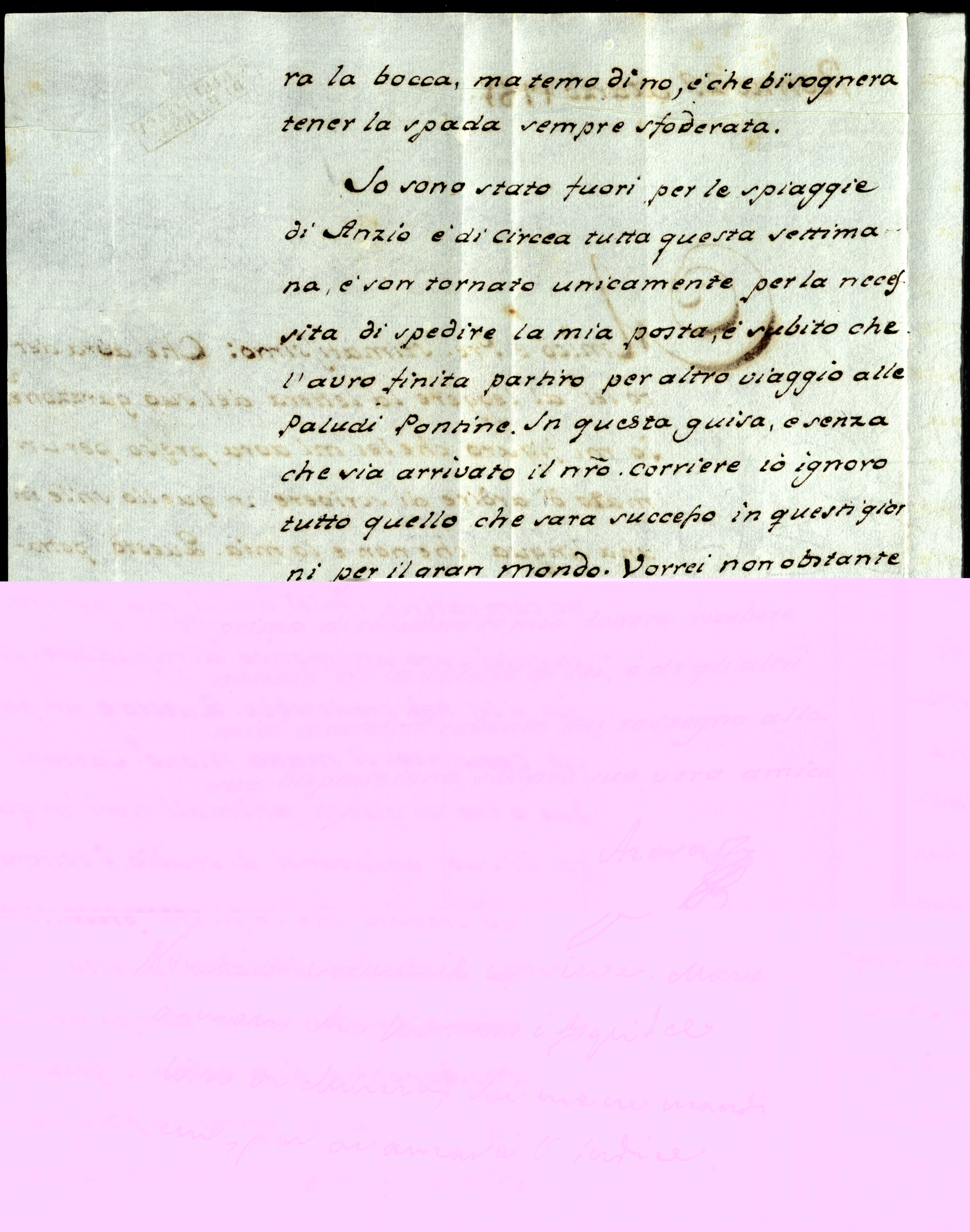 Io sono stato fuori per le spiaggie di Anzio e di Circea tutta questa settimana e son tornato unicamente per la necessità di spedire la mia posta; e subito che l’avrò finita partirò per altro viaggio alle Paludi Pontine. In questa guisa, e senza che sia arrivato il nostro corriere, io ignoro tutto quello che sarà successo in questi giorni per il gran mondo. Vorrei nonobstante, prima di chiudere le mie lettere, ricebere notizie di la salute di Lei e di gli altri miei amici.